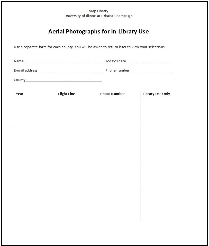 Distant library users especially are encouraged to use the online air photo index collection. If planning a visit to the Map Library, please call (217-333-0827) or e-mail well in advance (at least 10 working days) to verify that the Map Library will be open and adequately staffed to expedite requests. Map Library staff will attempt to expedite pulling requested photographs for visitors from out of town if the requests are received prior to 10:00am.