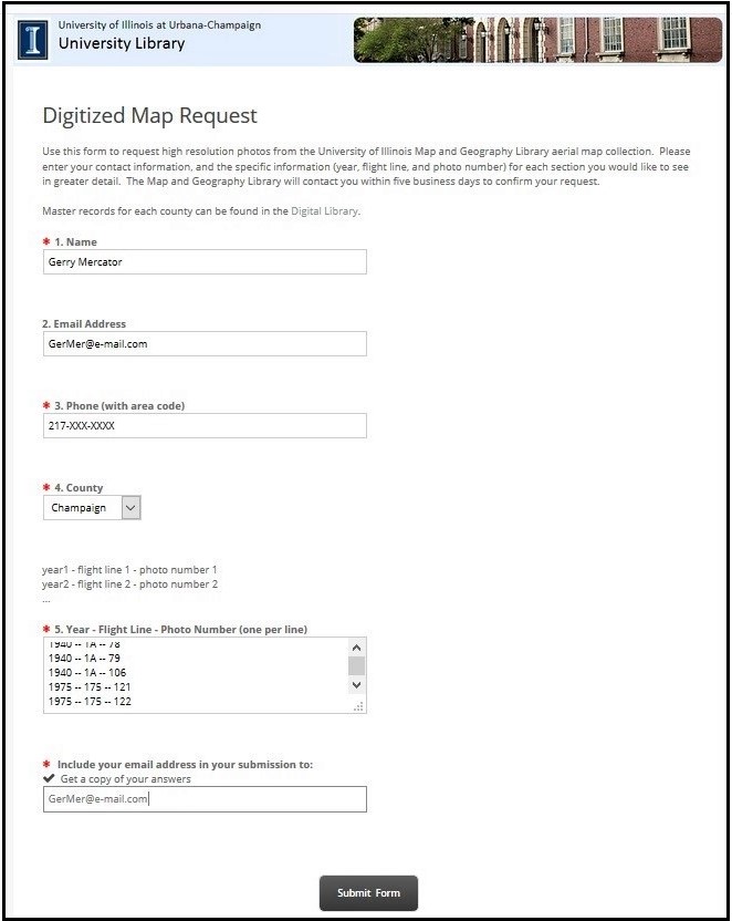 After desired photographs have been identified, patrons must submit a photo request form. A paper form is available in the Map Library and all online index web pages include a link to a web-based request form.