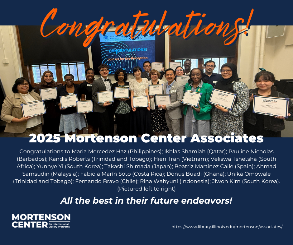 You are invited to the 2024 Mortenson Center Associates Showcase and Graduation. This year the Mortenson Center for International Library Programs welcomed 12 librarians from 11 countries in its Associates Program (June 3-26, 2024), who will be presenting on the theme