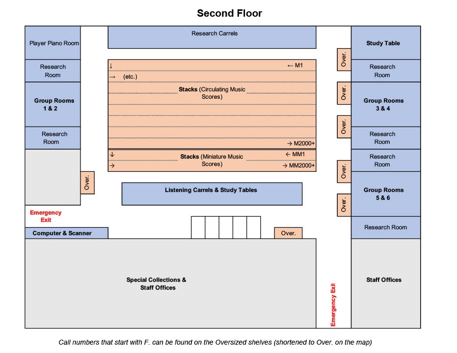 The second floor contains Study Tables, Research Carrels, Group Rooms 1-6, Research Rooms, a Computer & Scanner, the Player Piano Room, Special Collections & Staff Offices, and the Music Score Stacks M, MM, and Oversized.