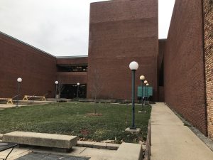 There are no bathrooms within the Library itself; all restroom facilities are located down the hallway in the Music Building.