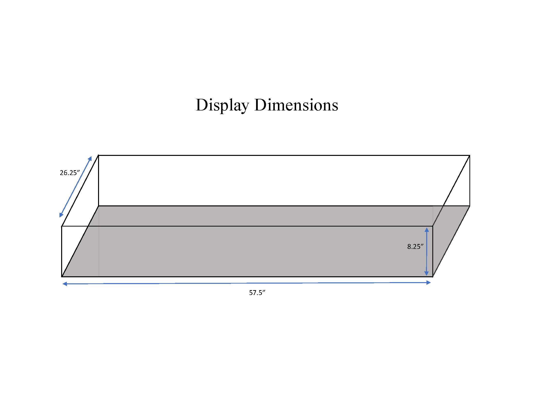 The flat display case is 57.5″ in width, 26.25″ in depth, and 8.25″ in height.