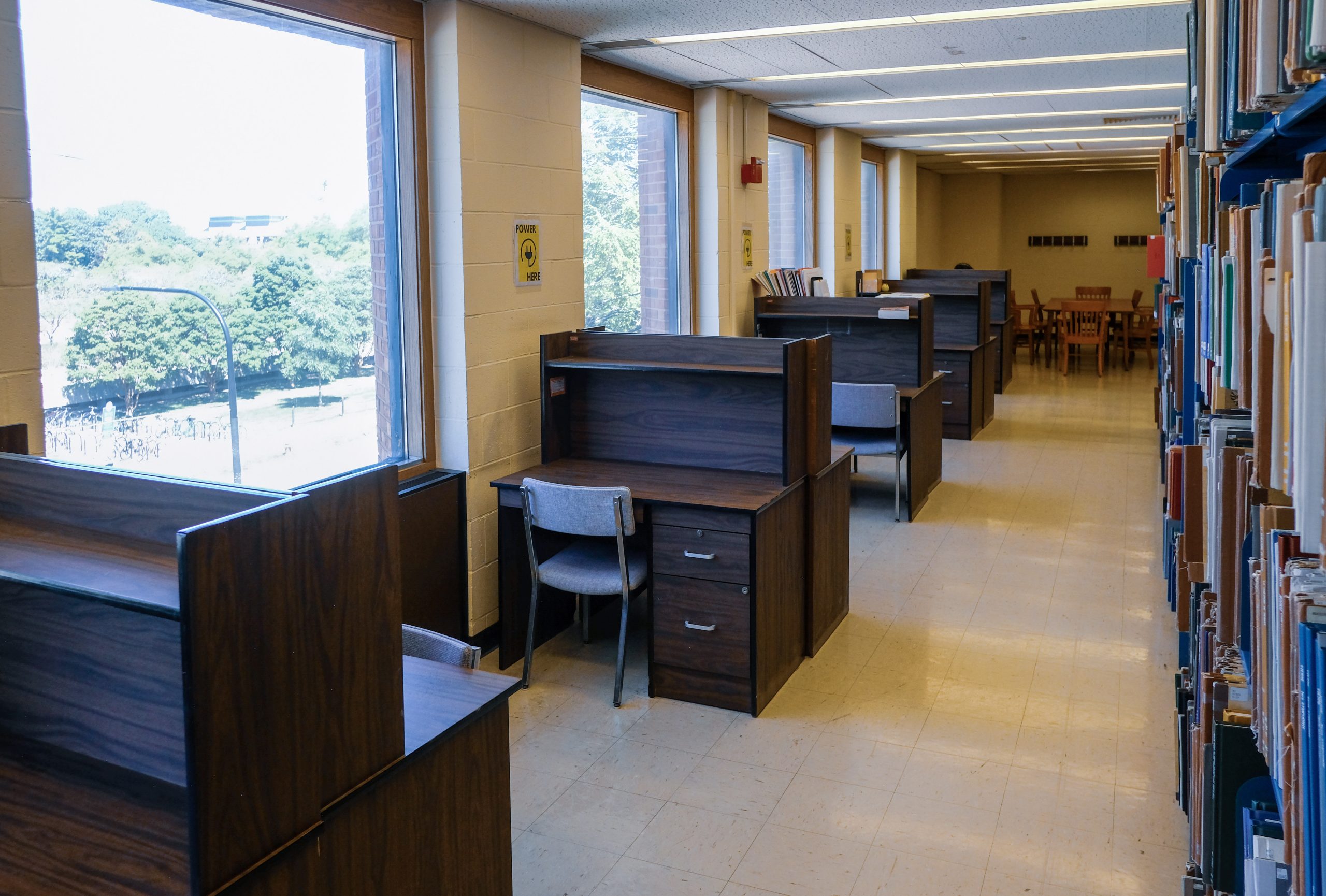 There are desks for individual study along the far north wall of the second floor along with an alcove with a large table for group study and collaboration. Neither require reservations and are available to all first-come, first-serve.