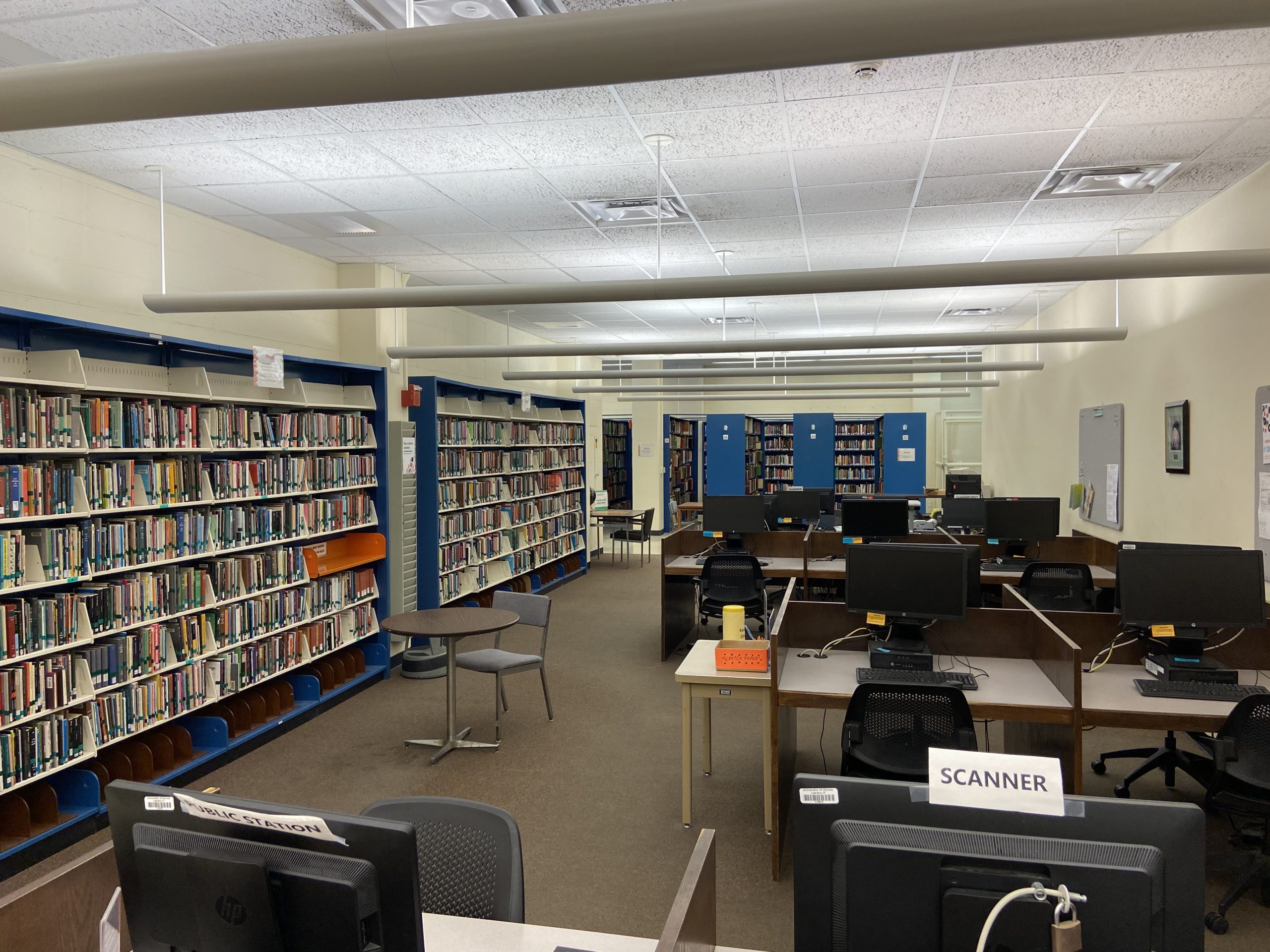 The computer area is located on the first floor of the Library, opposite the service desk. It’s a mixed-use space where people can talk, browse materials online, print, and scan. You’ll find: