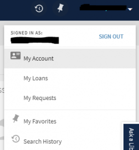 Click on “My Account” to access your currently checked out items (and have the option to renew them), your requests, and any fines or fees. You can also view your search history and any saved searches or items.