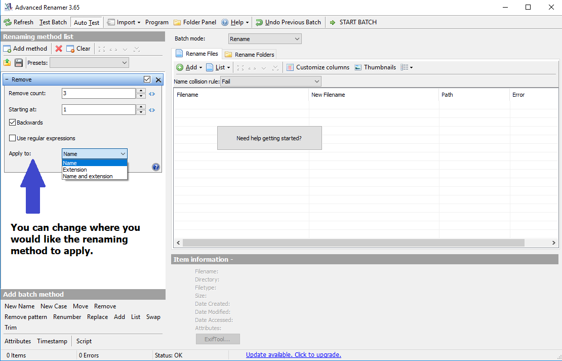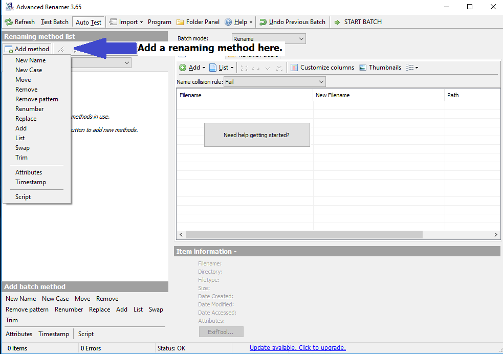 - Add a method in the “Renaming method list.” Some common methods we use is “remove”, “renumber”, “replace” and “add”; although you may use other methods.