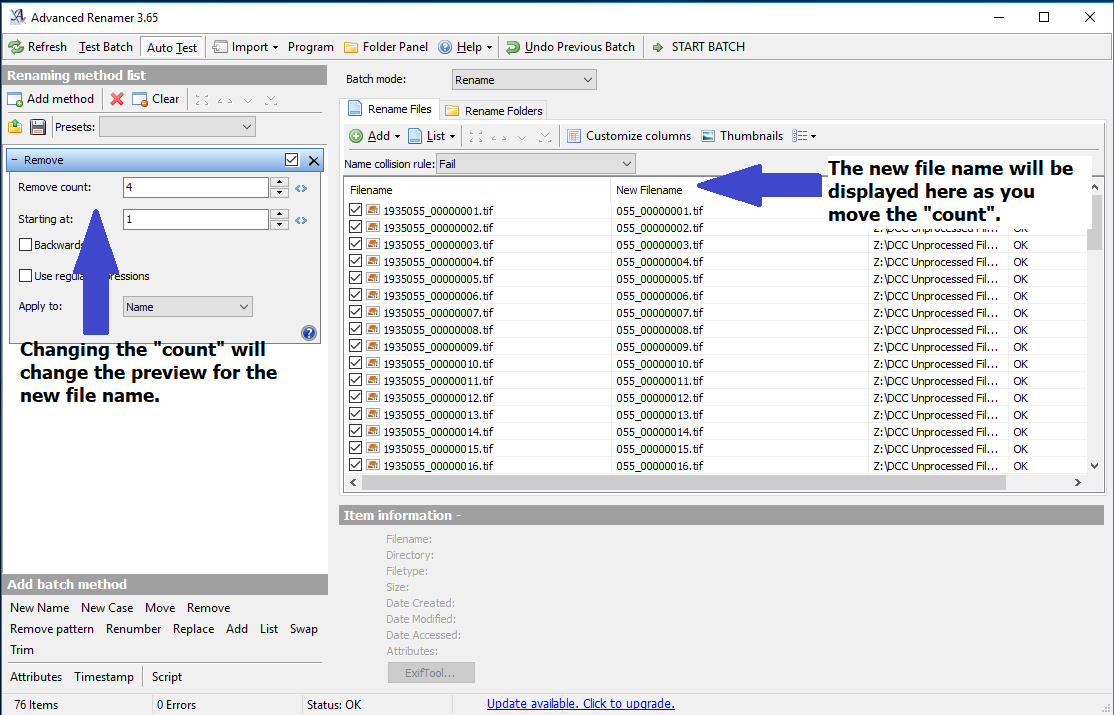 - A sample of the new file names will be displayed and you can adjust the “remove count” to reflect where you would like to begin removing information from the file name.