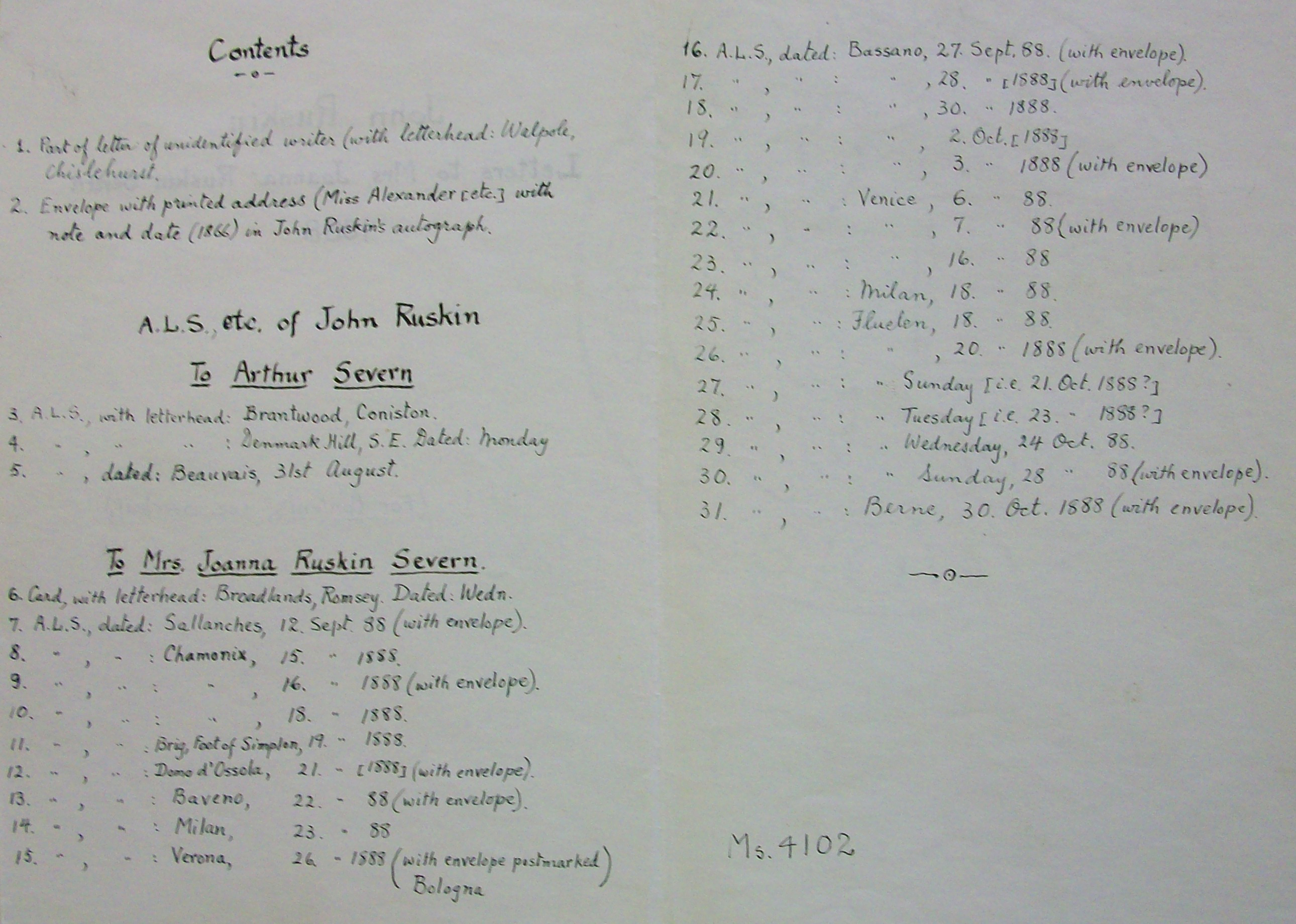 Sitting quietly in our vault, awaiting further study is a cache of thirty unpublished letters from John Ruskin to his Scottish cousin Joan (Agnew Ruskin) Severn. Ruskin wrote over 3000 letters to Severn, many of which have been published in the thirty-nine volume edition of The Works of John Ruskin by Edward T. Cook and Alexander Wedderburn, or, more recently in Rachel Dickinson’s 2009 book, John Ruskin’s Correspondence with Joan Severn: Sense and Nonsense Letters.