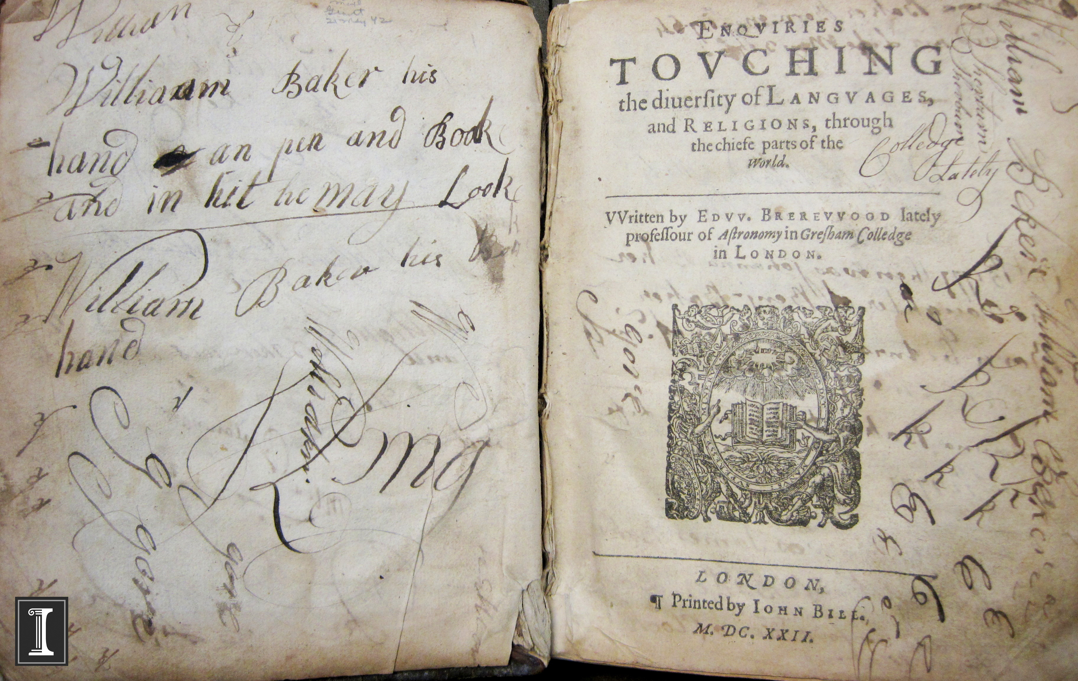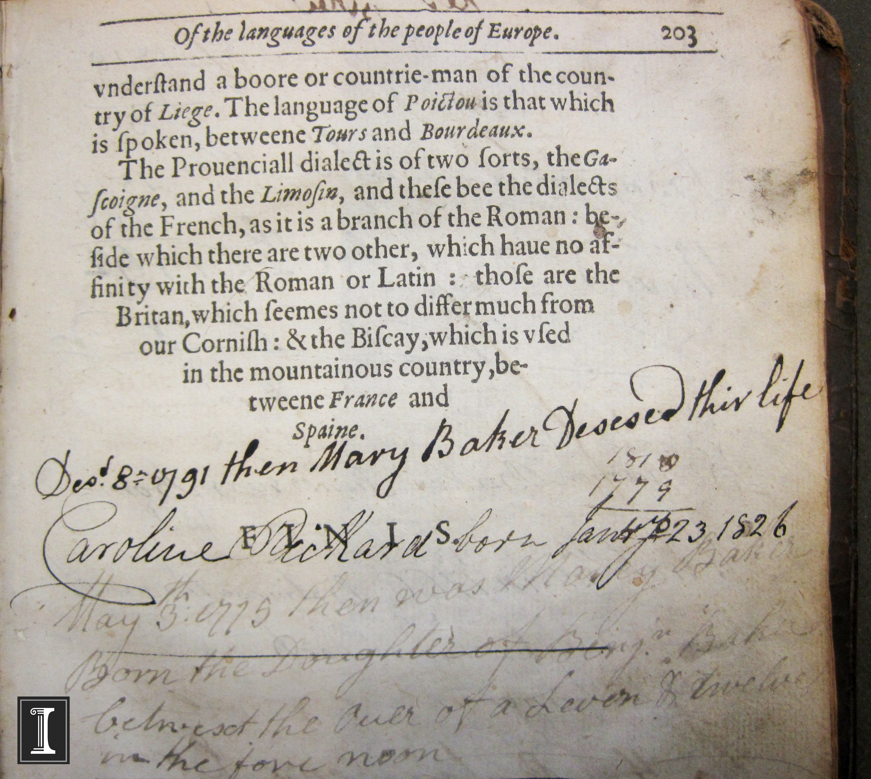 Still other owners used their books to preserve genealogical information like births, marriages, and deaths. Usually this information was recorded in a family Bible that was passed down to children, grandchildren, and beyond, each subsequent generation recording their own important family dates. Between roughly 1750 and 1830, the Baker family of South Milford, Yorkshire wrote their important dates, however, in a calf-bound volume containing two works: Edward Brerewood’s Enquiries Touching the Diuersity of Languages, and Religions, through the Chiefe Parts of the World (1622) and A Remonstrance of the Most Gratious King Iames I. King of Great Britaine, France, and Ireland, Defender of the Faith, &c. (1629) [409 B75e1622].