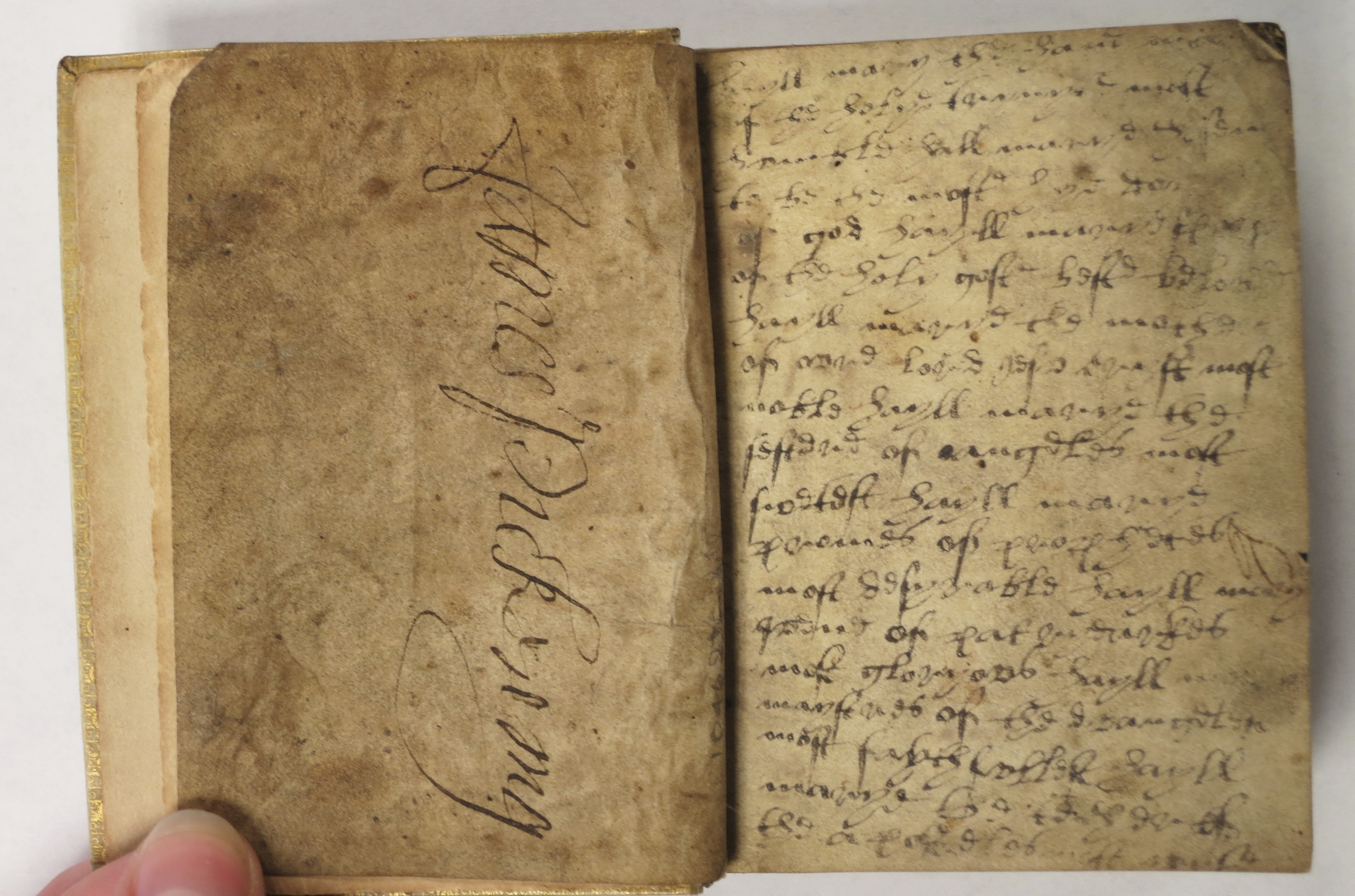 Finally, there is a leaf, somewhat faded, of devotions in an early hand at the front of the book. Though we have not fully transcribed it, certain phrases stand out: “hayll marye”; “most noble”; “holy gost”; “most desyrable.” Could they have been written by Henry or Catherine? We open up the question to our readers. We also welcome suggestions on the Henry inscription and information about Richard or James Pickering. SL
