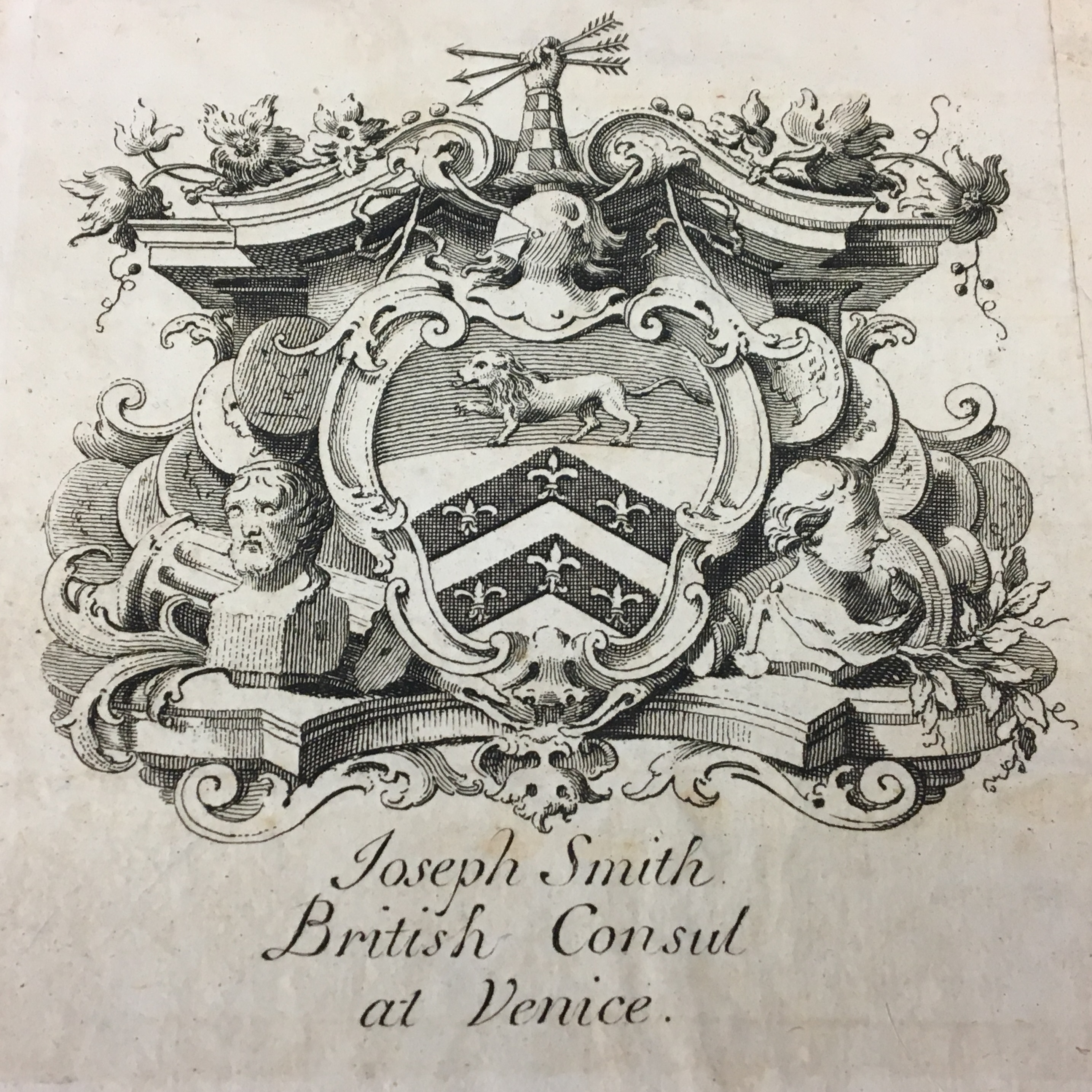 Above Garrick’s ex-libris, however, was another, this time announcing the volumes as having belonged to “Joseph Smith, British consul at Venice.” Though this name did not ring a bell with me, a few minutes’ research revealed Joseph Smith (circa 1682-1770) to have been one of the most celebrated bibliophiles of his generation, responsible for contributing to what would become the King’s Library at the British Museum, now in today’s British Library. First travelling to Venice around 1700 as a merchant banker, Smith held the position of British consul to Venice from 1744 to 1760, and died in that city in 1770.