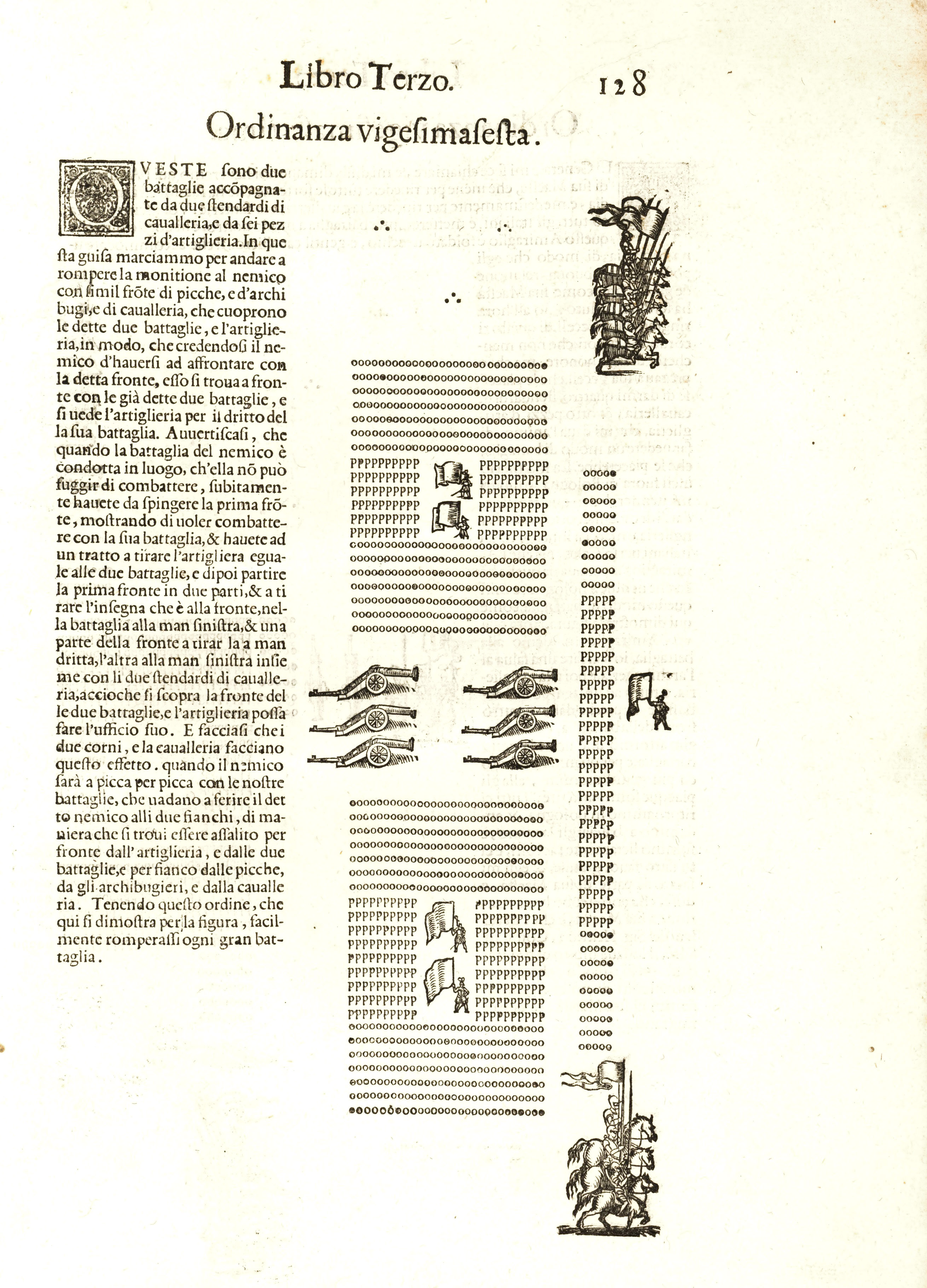 Novel illustrations accompany Coniano’s text, made up of combinations of small woodcut elements, depicting cannons, standard-bearers, and other military figures, and individual letters, each representing a different kind of soldier: o stands for archibugieri (musketeers); a for archieri (archers); r for acabie or ronche (halberdiers); p for picchieri (pikemen); and C for cavalli (cavalry). These formations must have challenged the typesetter, as they sometimes involve oblique orientations, the tight packing of type, and the careful layout of various sections of “troops.” (Even more burdened by this system of notation is modern optical character recognition, or OCR, technology, whose limits are revealed in some online versions of the text.) Other portions of the compendium are also visually rich. Maggi and Castriotto’s treatise has scores of illustrations of fortification methods, many containing text within the “frame” of the woodcut itself.