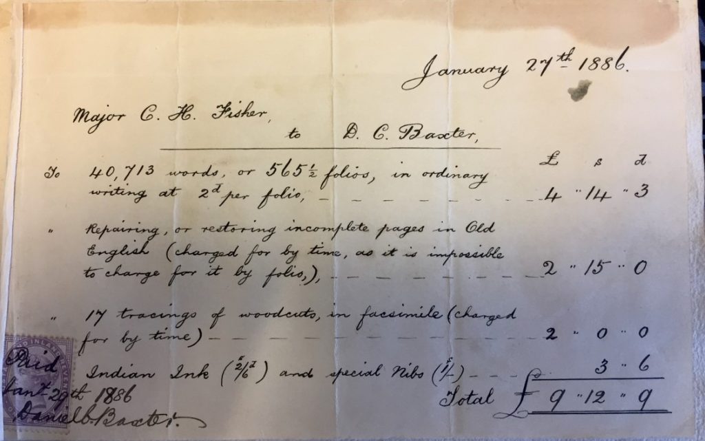 According to the cataloger’s note in the page gutter of RBML’s copy, the university purchased The boke of Chaucer from Stonehill in 1956, over 450 years after its printing. The additional material pasted onto the front flyleaves make it clear that the book was previously owned by the British Museum before coming to reside in the Rare Book and Manuscript Library. On the recto of the second front flyleaf, there is a bill from Daniel C. Baxter to Major C. H. Fisher dated January 27, 1886 listing the charges for the facsimile leaves and woodcuts. The bill comes to a total of nine pounds, twelve shillings, and nine pence, with individual charges such as, “40,713 words, or 565 ½ folios, in ordinary writing at 2d per folio” costing £4.14.3 and “17 tracings of woodcuts in facsimile (charged for by time)” being £2.0.0. More information is provided on the recto of the fifth flyleaf in a short note dated January 28, 1886 and signed “Edward Ernest Stride, British Museum,” which reads: “The leaves supplied in MS. and the tracings of the woodcuts & of the printer’s mark have been executed by Mr D. C. Baxter, of the Dept. of Printed Books, British Museum.” Additionally, on the recto of the fourth flyleaf, someone—presumably Baxter—has written, “The following memorandum is pasted into the copy of this work in the British Museum, and is believed to have been inserted by Sir Thomas Grenville; who bequeathed this work with his library, to the Museum,” indicating that the missing text and illustrations have been copied from The boke of Chaucer in the Grenville collection, currently housed at the British Library.