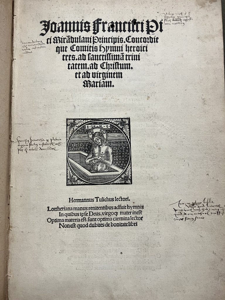 Open a vellum binding, blind-stamped and splayed with age, to discover a rare edition of Giovanni Francesco Pico della Mirandola’s Hymni heroici tres, printed in Leipzig in 1514 by Melchior Lotter (who, three years later, printed the first edition of Martin Luther’s Ninety-five Theses). The library’s copy (Call Number: Q. 875.1 P58h1514) is inundated with manuscript notes in a contemporary cursive hand, including a sketch of the celestial spheres. It appears that readers and bookworms alike have found nourishment in its pages, which have been enthusiastically nibbled.