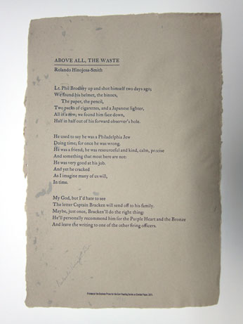 This poem by Rolando Hinojosa-Smith was printed by Steve Kostell and Marten Stromberg in collaboration with the author. It is the inaugural broadside of the partnership of the Soybean Press with the Carr Reader Series at the University of Illinois. The poem deals with combat suicide and is printed on paper made from combat-ready uniforms by the Combat Paper Project.