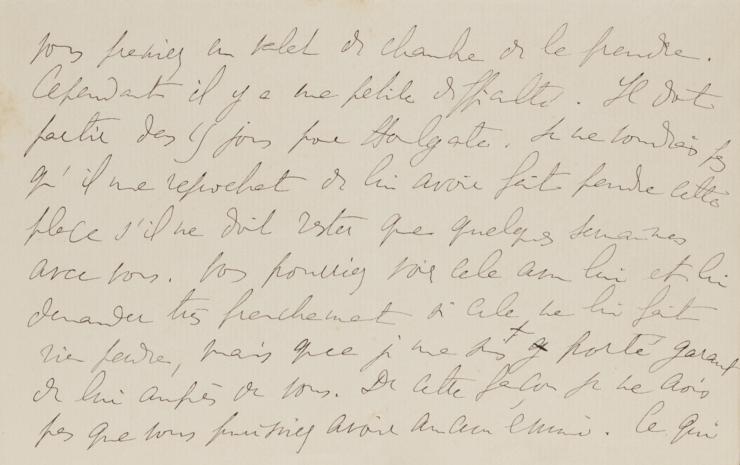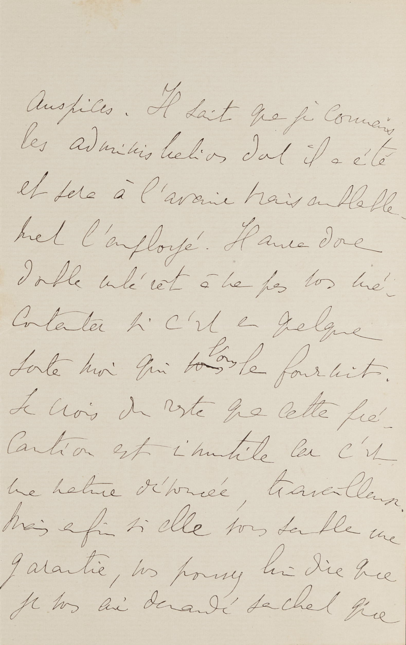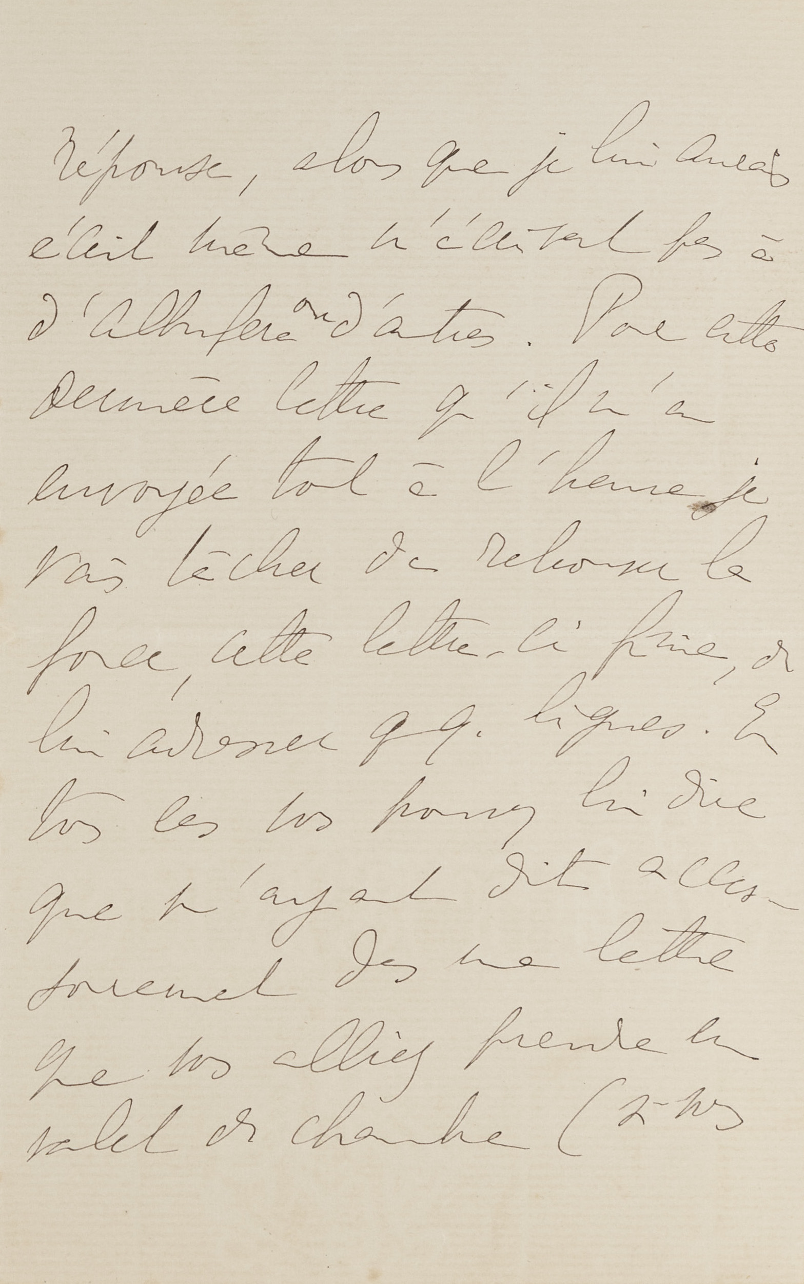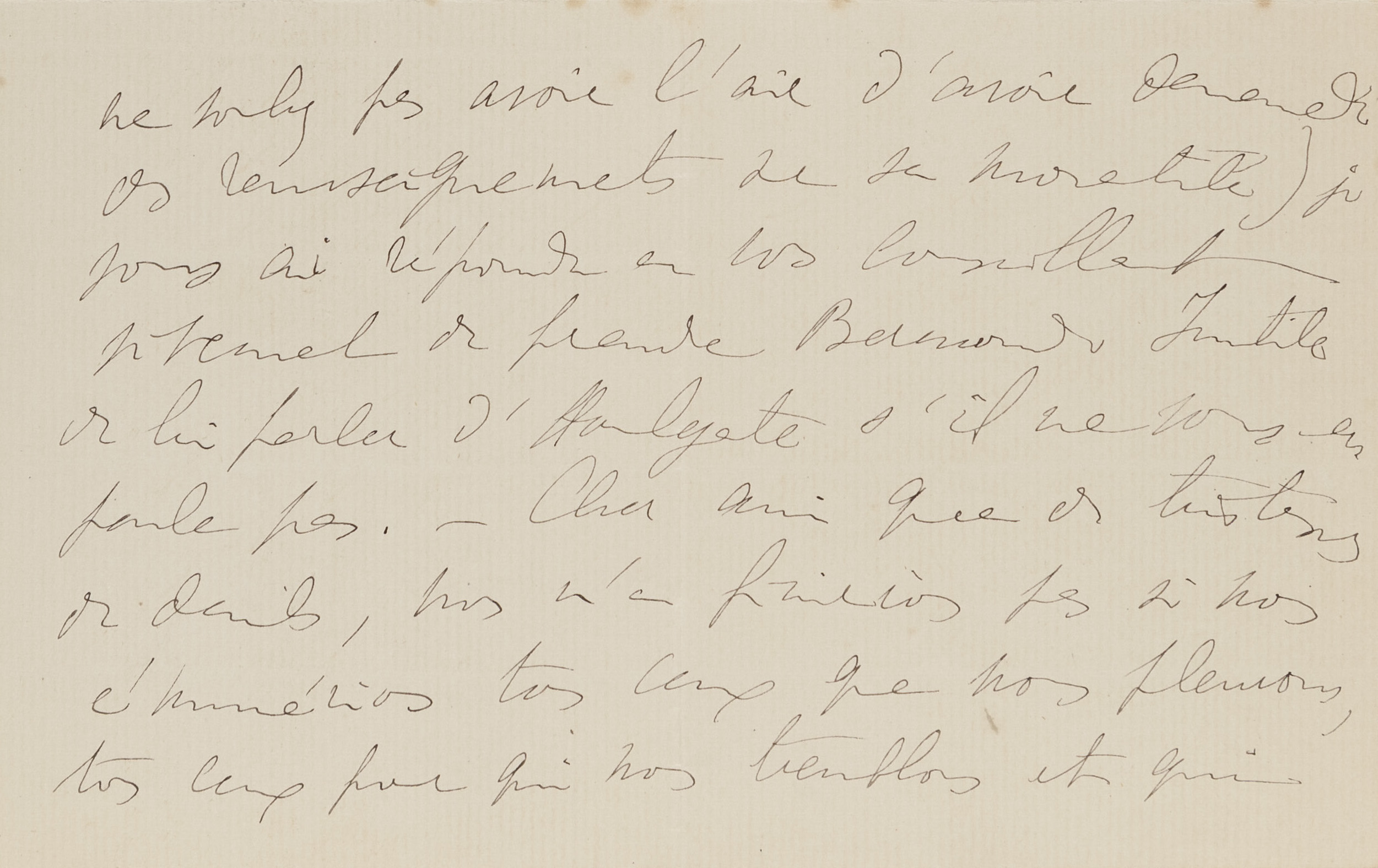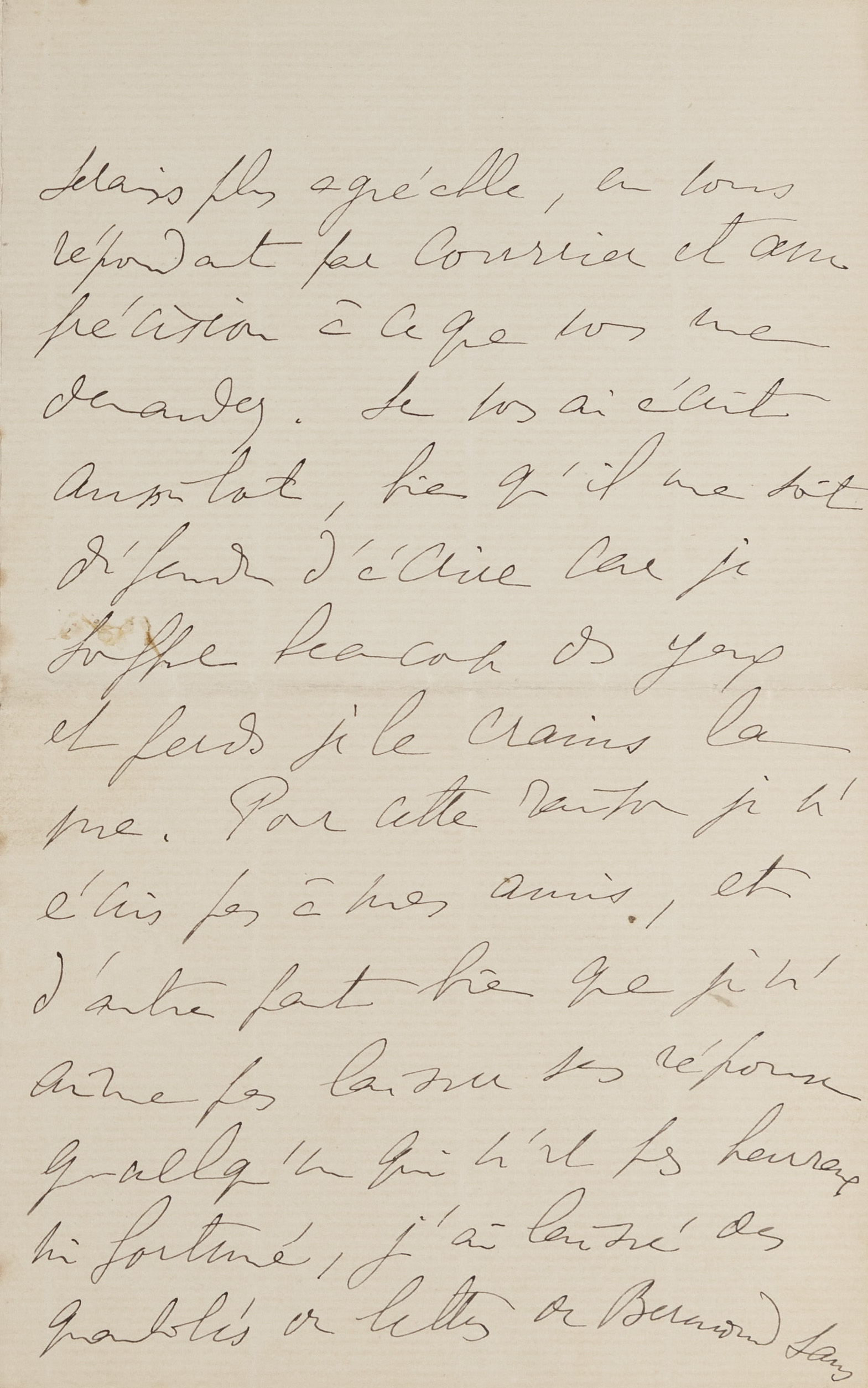 I have never had Antoine Bermond [3] in my service, but I have often used him for one thing or another and I have had nothing but praise for him. My impression is that he is deeply honest. However, I think you would perhaps have an additional guarantee by doing the thing under my auspices. He knows that I know the administrations of which he has been and probably will be the employee in the future. It will therefore be twice as interesting for him not to displease you if it is, in a way, myself who sent him to you. I believe that this precaution is useless because he is of a devoted, hardworking nature. But in the end, if it seems to you an added security, you can tell him that I asked you, knowing that you were taking a valet, to take him. However, there is a small problem. He must leave within 15 days for Houlgate [4]. I would not want him to reproach me for making him lose this position if he only must stay a few weeks with you. You could see that with him and ask him very plainly if it does not make him lose anything, but that I vouched for him with you. This way, I do not think you can have any trouble. What surprised me was to find in the same delivery as your letter, one from him telling me about his possible departure for Houlgate. It is probably pure coincidence. Otherwise it should be assumed that someone you know has told him about your plans and perhaps as a way to precipitate them, he decided to tell me about Houlgate. But to tell the truth, I believe rather in a mere coincidence. Dear friend, I would have liked especially to tell you all the pleasure I had receiving a letter from you, and all the friendship I have for you, but I thought that I would be more pleasant to you, by answering in writing and with accuracy the question you asked me. I wrote to you without delay, although I am forbidden to write because my eyes cause me much suffering and I fear I am losing my sight. For this reason, I do not write to my friends, and while on the other hand I do not like to leave someone who is not happy or fortunate without an answer, I have left quite a number of letters from Bermond unanswered, while I would have written to him while not even writing to d’Albufera [5] or to others. For this last letter he sent me earlier I will try to regain the strength, once this letter is done, to send him a few lines. Anyway, you can tell him that I had incidentally said in a letter that you would be taking a valet (if you do not want to seem to have inquired about his morality) and that I replied urging you to take Bermond. You do not have to tell him about Houlgate if he does not tell you about it.