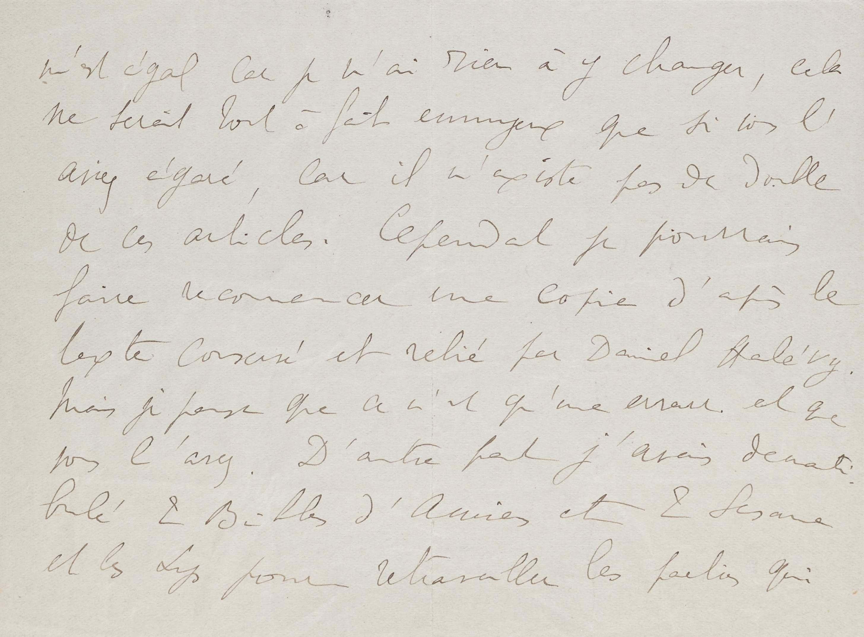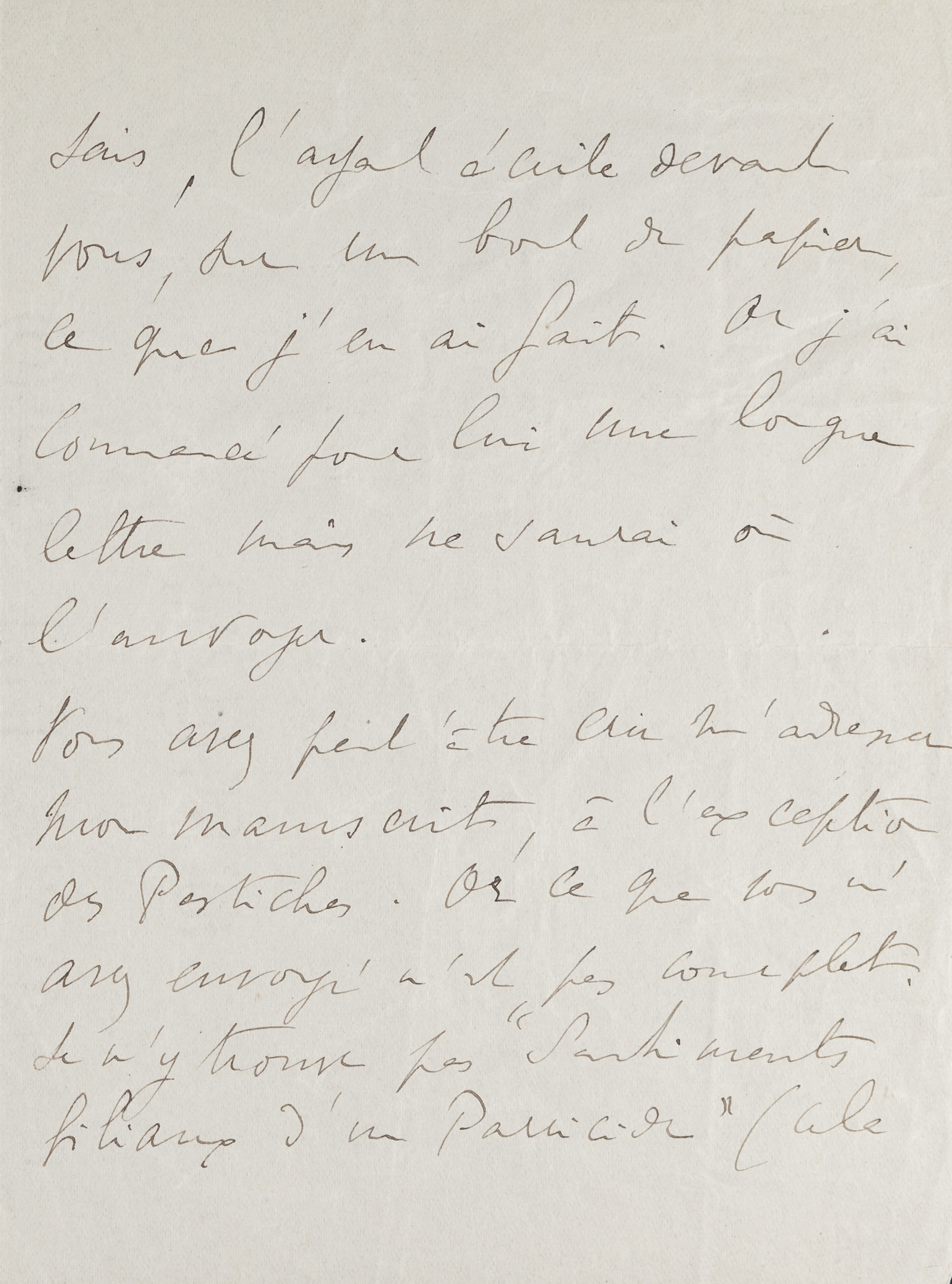 Proust’s impatience on the progress of these projects is apparent in this letter. He had sent his articles from Le Figaro and was waiting for proofs from the printer Gallimard had found, La Semeuse. Here, Proust explains that he “cannot find ‘Sentiments filiaux d’un parricide’” among the articles sent to him by Berthe Lemarié; he thinks that “this is only a mistake and you must have it.” Once again, we see that Proust did not keep archives of his articles.