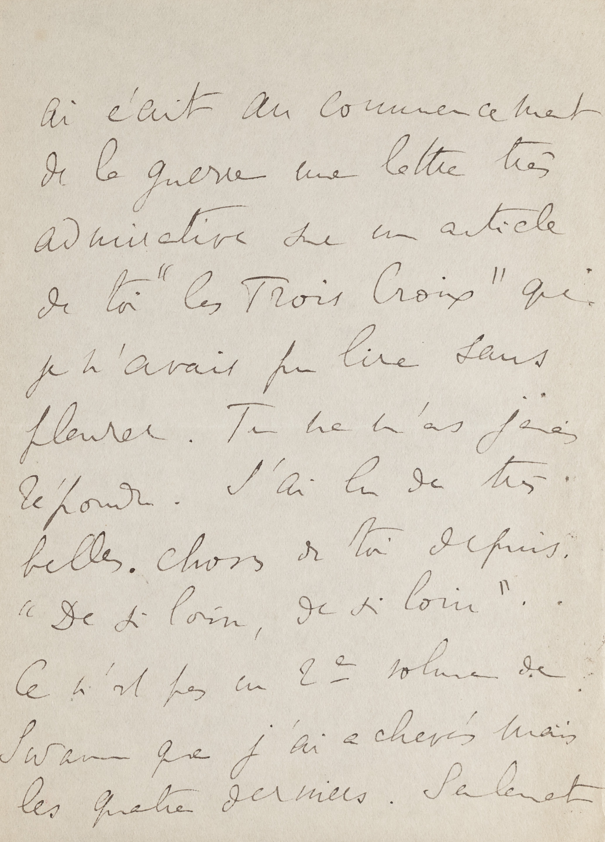 This letter from Proust to his friend Daniel Halévy starts by evoking the missing article “Sentiments filiaux d’un parricide.” Proust knew that Halévy had a copy of the article. Halévy, indeed, raved about the article when it was published and had it bound in a “plaquette,” a thin booklet. Since Berthe Lemarié, the secretary of the Nouvelle Revue française, did not have the article, as we can see in the previous letter, Proust had to request Halévy’s copy. This letter thanks Halévy for having sent it, and Proust refers to the booklet as a “magnificent piece of work.” He also mentions the “beautiful things” he has read from Halévy, who published articles in newspapers and literary or political magazines, including pieces about the war.
