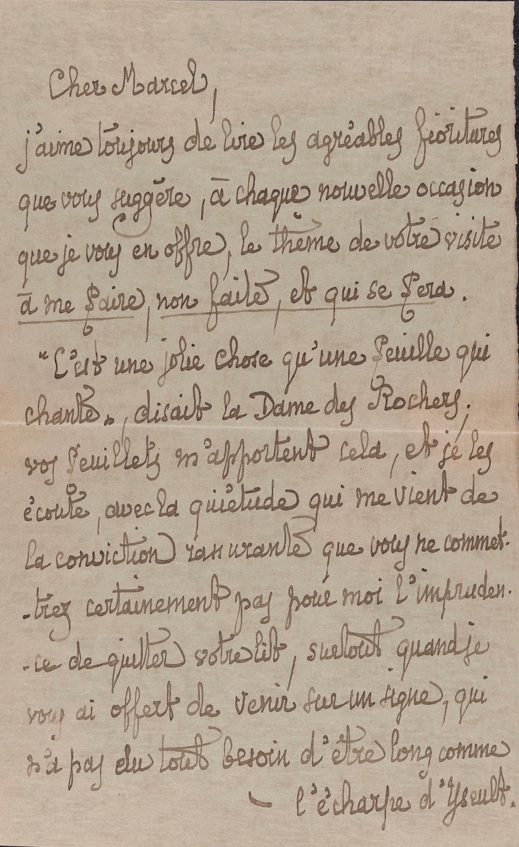 “What a pretty thing, a page that sings” said the Lady of the Rochers [3]; your pages provide me this, and I listen to them, with the tranquility that comes from the reassuring conviction that you would certainly not, for me, commit the imprudence of leaving your bed, especially since I offered to come at the slightest sign, which need not be long like Yseult’s scarf [4].