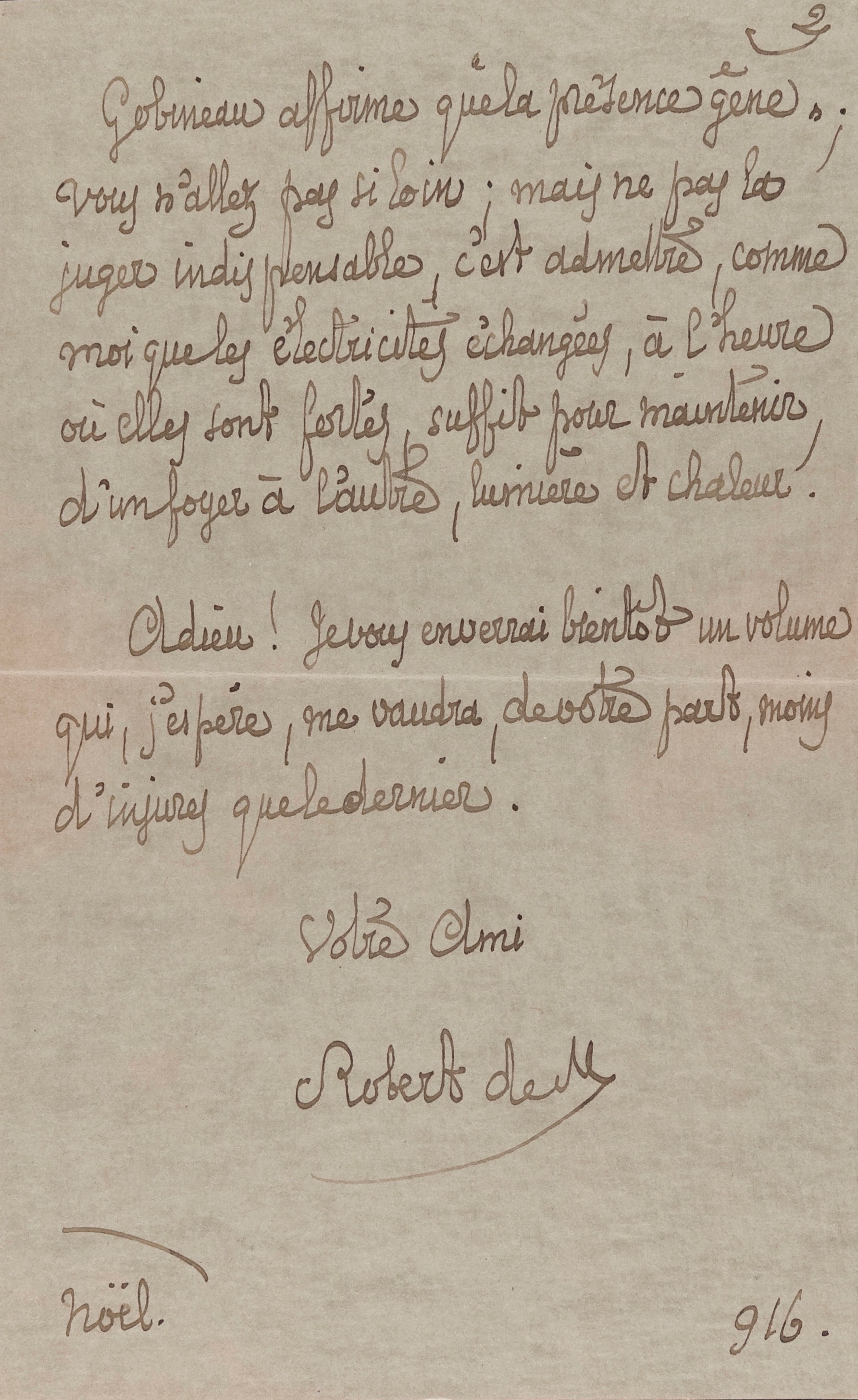 Gobineau affirms that “presence discomforts” [5]; you do not go so far; but not to judge it indispensable is to admit, like myself, that exchanged electricity, at the time when it is strong, suffices to maintain, from one foyer to another, light and heat.