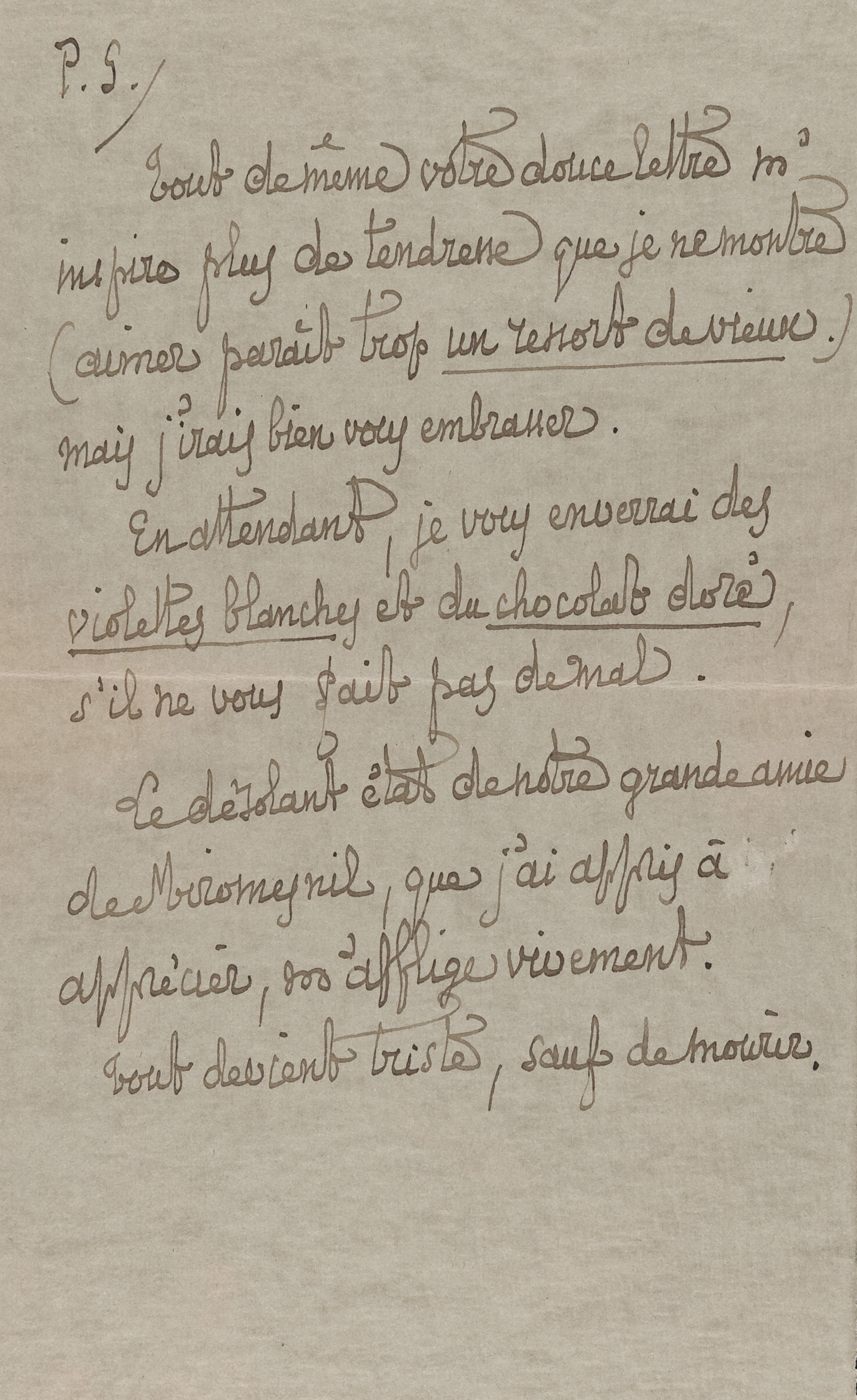 P.S. – All the same your kind letter inspires in me more tenderness than I show (love seems too much like a trick of the elderly), but I would like to embrace you nonetheless.