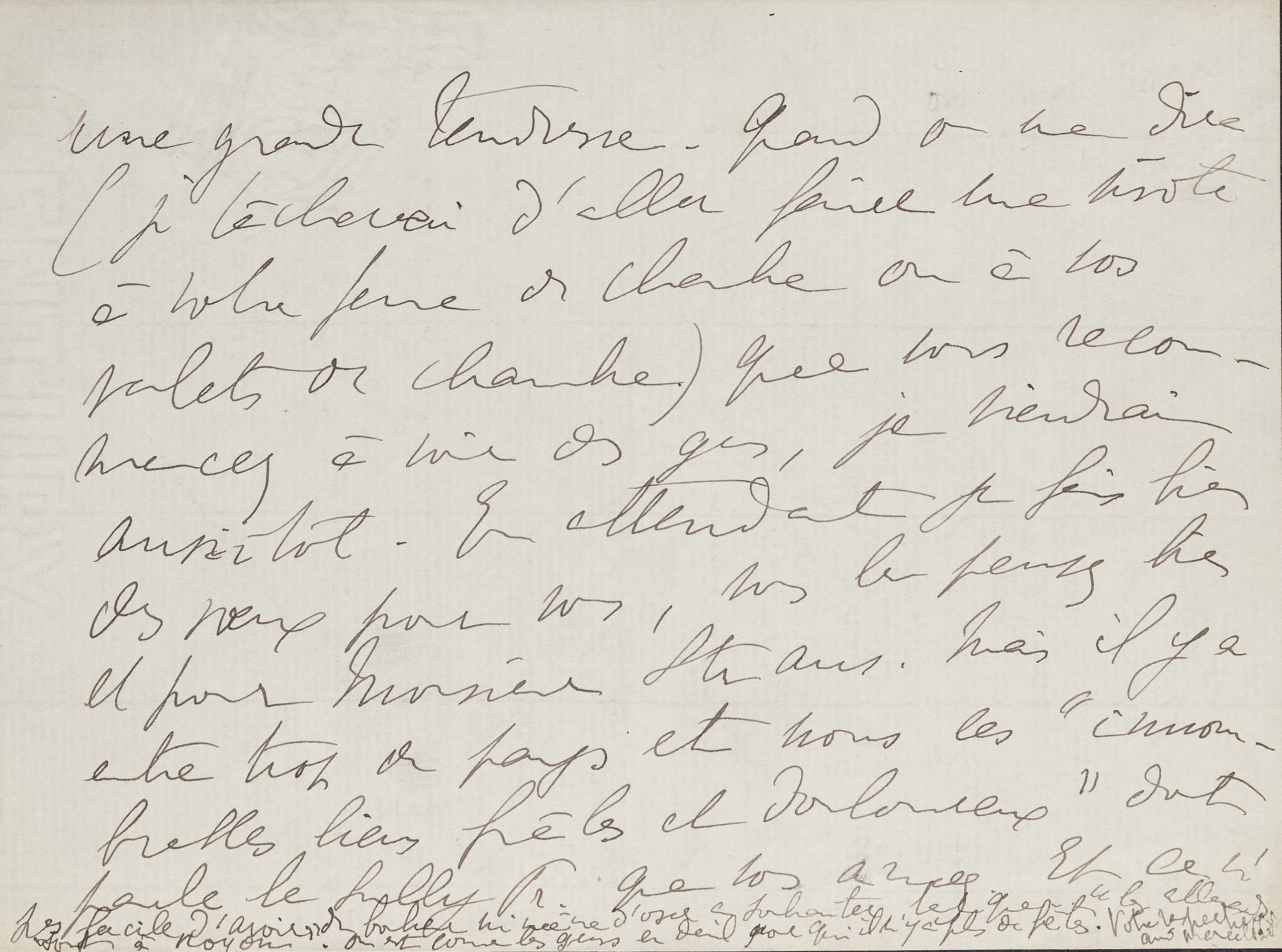 Unfortunately, you are not the one “with whom I slept” [10]! I hesitated to write all of this to you, although it is the truth, for the reason I just mentioned, and also, because I think that if you are undergoing a rest cure, you might not want to receive letters. No sooner had your letter arrived than I learned, like every time that one no longer needs to know something[,] that you were indisposed, in a letter from Montesquiou [11] who was saddened by this with great tenderness. When I am told (I will try to make a visit to your chambermaid or to your manservants) that you are seeing people once again, I will come immediately. In the meantime, I am sending well-wishes, have no doubt, to you and to Monsieur Straus. But there are, between too many countries and ourselves, “innumerable fragile and painful ties” which Sully Pr[udhomme], whom you like, wrote about [12]. And it [is] not easy to have happiness, nor even to dare to hope for any, as long as “the Germans are in Noyon” [13]. We are like people in mourning for whom there are no celebrations.