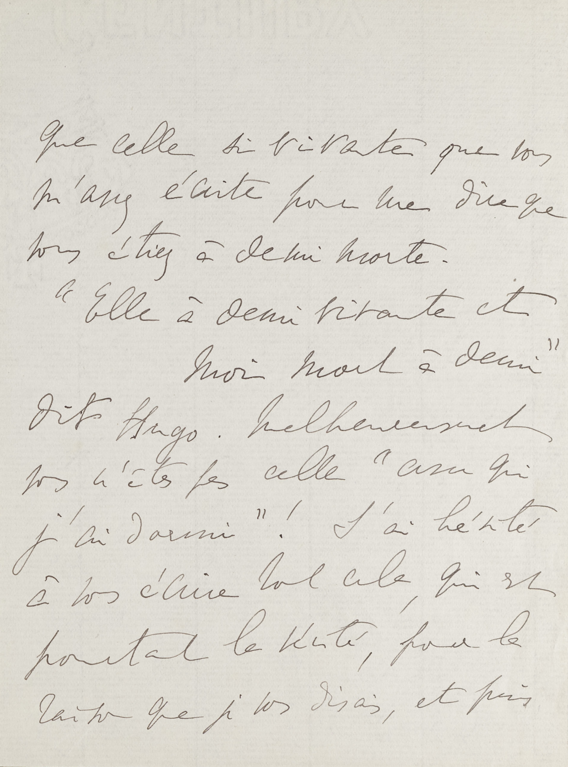 I know it is irritating to hear that one is looking well when one is suffering. Therefore, I hesitated to write you that I have never received from you a letter as lovely, as attentive, in such good form, having a better “voice” and more “color” than the one, so lively, that you wrote to me to tell me that you were half dead [9].