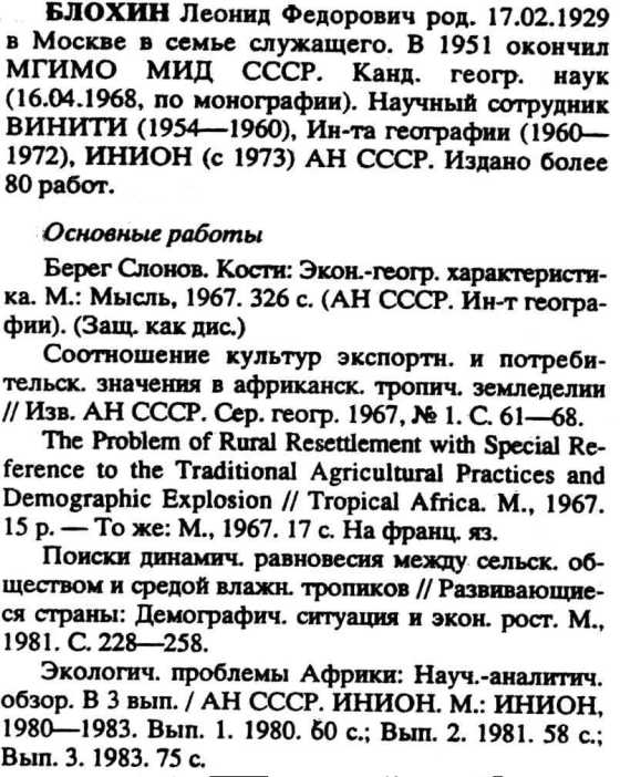 This dictionary includes biographical sketches and bibliographies for Soviet orientalists who have produced at least 10 scholarly publications. By orientalists the compilers mean anyone who studies the culture or social sciences of Asia, Australia, or Africa. Many people who were left out of the first edition have entries in this edition, including orientalists who were repressed during the 1930’s-1950’s. All entries contain biographical data and bibliographies of the most important works. The entries are arranged alphabetically by surname with a few additional entries appearing at the back in the Dopolneniia . A helpful index at the back arranges the entries by region and then by subject. See the entry to the right for Leonid Fedorovich Blokhin.