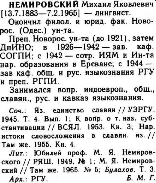 With over 1500 entries, this dictionary of Slavists continues the work of the volume listed above on prerevolutionary Slavists by providing biographies of Soviet Slavists including immigrants from foreign countries who published in the former Soviet Union. What distinguishes this work from its predecessor besides the dates of coverage is that this one focuses on Slavists who study West and South Slavic cultures. The entries are written by researchers from the Institut slavianovedeniia i balkanistiki at the Russian Academy of Sciences and include biographical,educational and career information for each Slavist as well as bibliographical references for the most important works by and about the Slavist. Entries are arranged alphabetically by surname. See the entry on the left about the linguist, Mikhail Iakovlevich Nemirovskii.