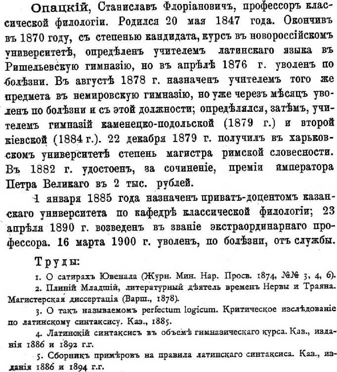 Although this set is covered by the Russian biographical archive, it is listed here because it is particularly valuable and deserves to be more well-known. It includes biographies of faculty members at the Imperial Kazan University from 1804-1904. Besides biographical data, entries have bibliographies of published works including citations for dissertations, and bibliographies of works in manuscript form. Entries are arranged into sections based on the university fakul’tet. The first volume contains the faculty members from the Orthodox Religion, Historico-Philological, and Physico-Mathematical fakul’tety. The second volume contains the faculty members from the Law, Medicine, and Art fakul’tety. At the end of the second volume there are a few appendices which list other people associated with the University including various deans and also a name index for both volumes. See the entry on the right for Stanislav Opatskii, a professor of classical philology.