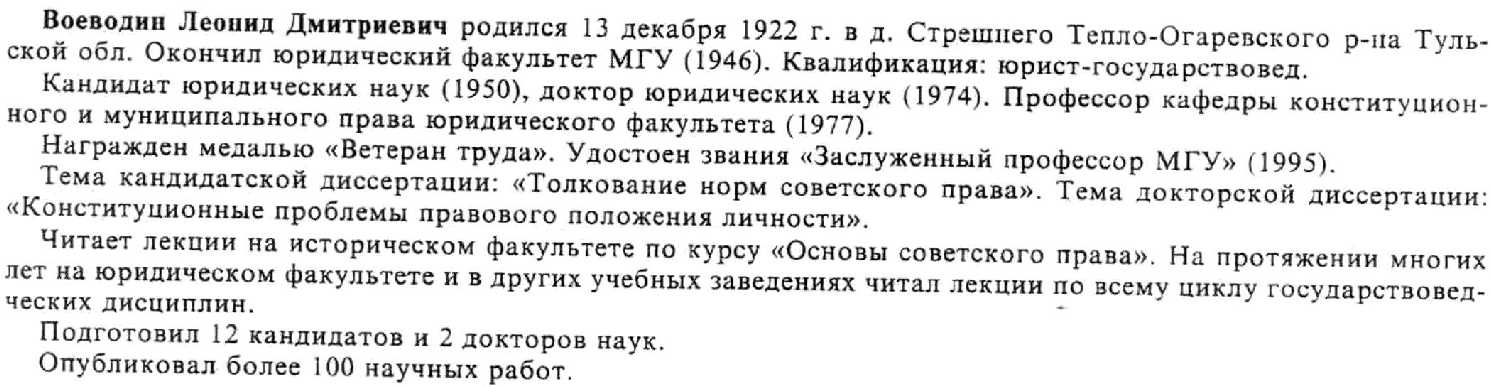 With over 1800 short biographies, this source is valuable for finding information on professors and scholars who taught at MGU in the 1996-1997 academic year. Entries contain basic biographical data, scholarly fields of interest, education, and life and career highlights. Entries are arranged alphabetically by surname with an index that groups them by fakul’tet. Unfortunately, the bibliographic references are scanty, but you can get an idea of how many publications each scholar has produced since that number is given in each entry. See the article on Leonid Voevodin.
