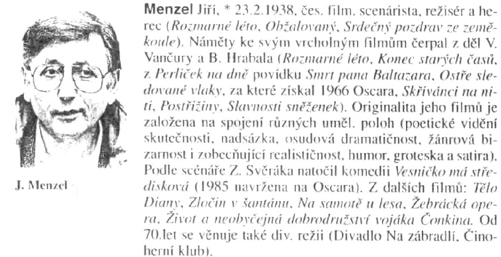 This encyclopedia in four volumes is the latest addition to the collection of Czech general encyclopedias. Although there is no introduction explaining the rationale or methodology behind the compilation of a new encyclopedia in Czech, there is a long list of contributors at the back of each volume. This encyclopedia does not just provide updated information over the previous one, but as a post-Communist publication it also has different entries. For example, the previous encyclopedia had numerous entries for various Russian historical figures which are lacking in this encyclopedia. Biographical entries provide dates of life, brief statements of historical significance, and often a portrait. Entries are brief with no bibliographic references, but there are many color and black and white illustrations. See the entry on the left for the Czech director Jiri Menzel.