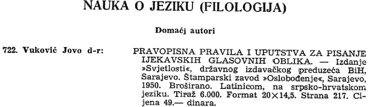 This work was followed by a bibliography covering 1952 entitled Bosanskohercegovacka bibliografija knjiga za 1952. godinu, but U of I lacks this volume. In 1977 a regularly produced national bibliography Bibliografija bosanskohercegovacke knjige for B & H began to appear. It was produced by the Narodna i univerzitetska biblioteka Bosne i Hercegovine in Sarajevo and ran from 1977-1984. U of I lacks this title as well. For more details on the national bibliography the sources mentioned in the introduction.