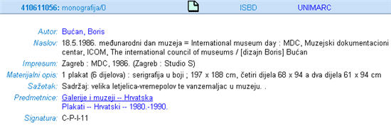 The union catalog of Croatia or Skupni katalog includes the holdings of not only the National Library, but many of the major academic libraries of the country, but it is unclear exactly how many Croatian libraries are involved. There are simple search and advanced search options which allow for the construction of some fairly sophisticated searches. The Croatian version of the website provides statistics on the number of records in the catalog: almost 350,000 monographs, over 106,000 article citations, over 40,000 serial records and about 800 collected works. The entry shown below is an example of a 1988 publication in the union catalog.