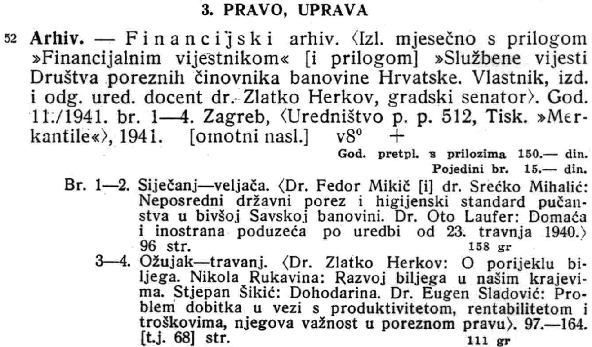This bibliographic serial was issued in 12 numbers per year for a four year period, 1941-Apr. 1944. It covered Croatian monographs, music, periodicals, and series. The entries are arranged by subject with periodicals listed by significant title word. Each issue has an author index, a list of series and their individual volumes, and an index of translators and editors. The last issues of 1941-1943 have annual indexes for authors. This serial was the national bibliography for the Croatians during the turbulent World War II years. The introduction to the first issue claims that they are including all publications issued during a particular year. See the entries below which appeared in the 1941:5-6 issue under the heading of law.