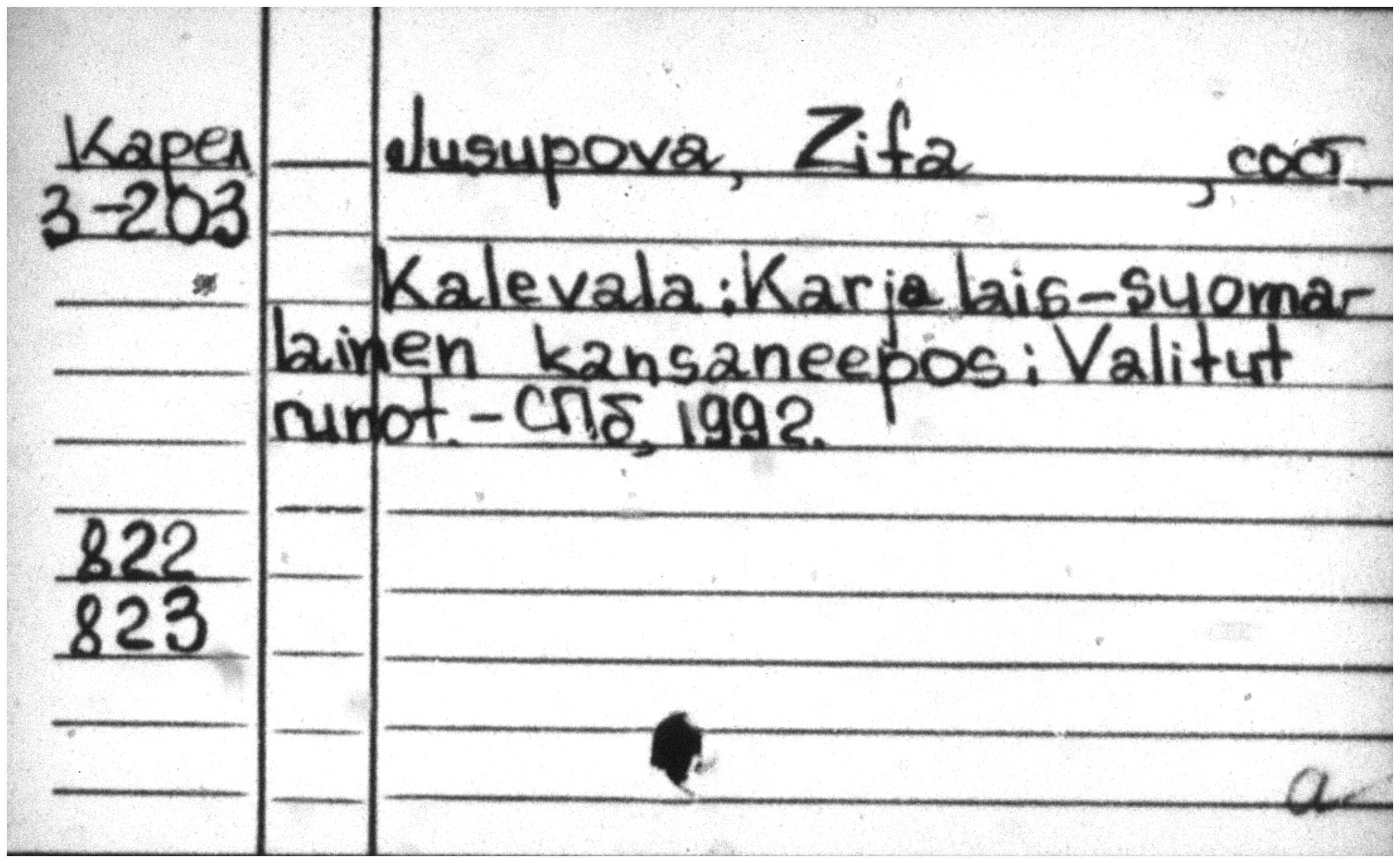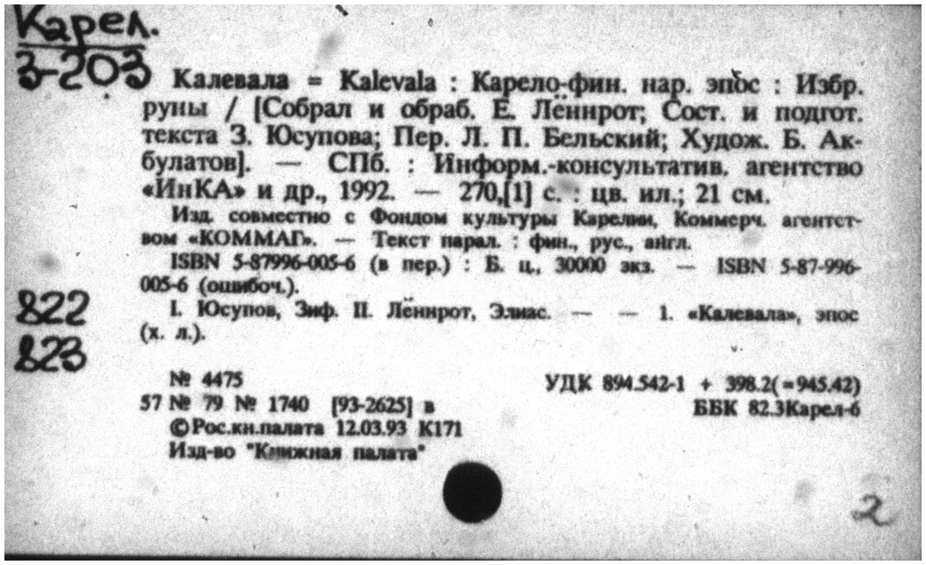 The Russian National Library’s Department of Literature in National Languages [also known as the Department of National Literatures] of the Russian Federation, Commonwealth of Independent States, and the Baltic countries has reproduced holdings catalogs in microfiche format. The national languages imprints catalogs in microfiche format diffuse most of the difficulties associated with transliteration in the vernacular languages, spelling, forms of entry, and uncertainties with the entirety of the collection. Researchers can access the entire holdings for a specific language at the Russian National Library through the microfiche set; conveniently exporting selected titles via PDF scans. The following scans reflect some of the Karelian-language holdings available in microfiche format.