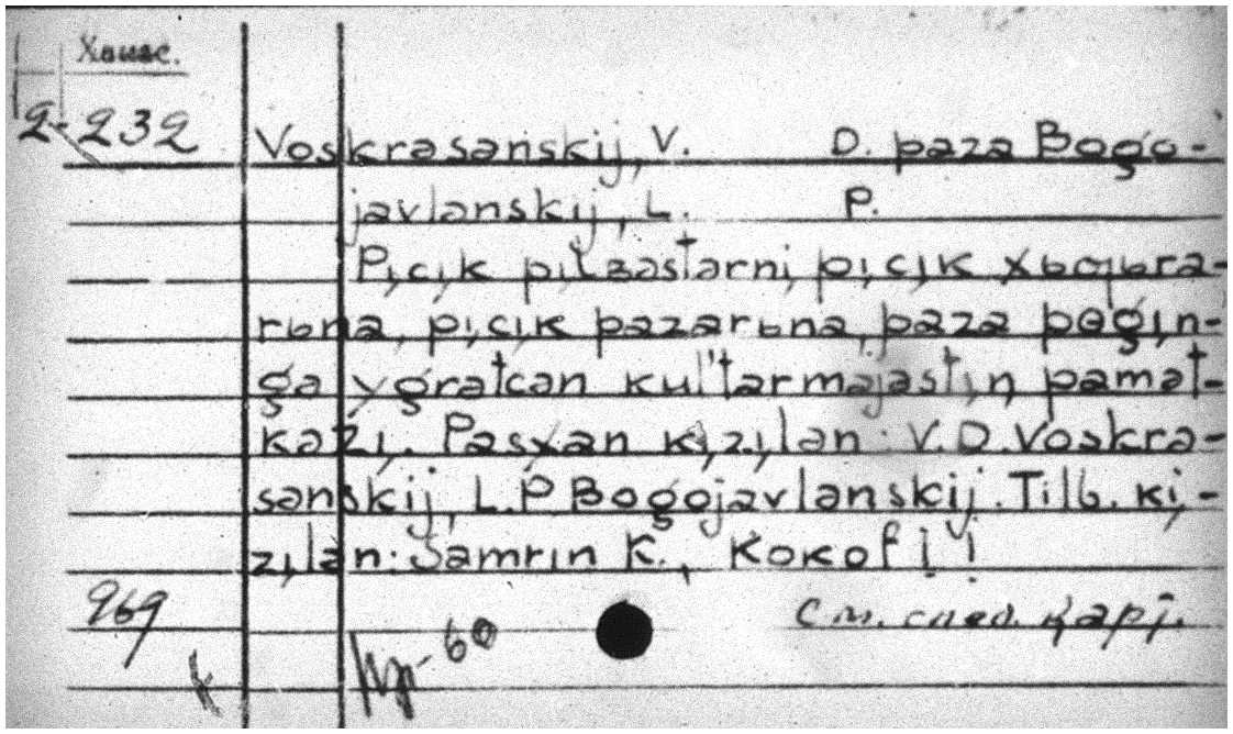 The Russian National Library’s Department of Literature in National Languages [also known as the Department of National Literatures] of the Russian Federation, Commonwealth of Independent States, and the Baltic countries has reproduced holdings catalogs in microfiche format. The national languages imprints catalogs in microfiche format diffuse most of the difficulties associated with transliteration in the vernacular languages, spelling, forms of entry, and uncertainties with the entirety of the collection. Researchers can access the entire holdings for a specific language at the Russian National Library through the microfiche set; conveniently exporting selected titles via PDF scans. Below are examples of some of the Khakas language holdings that are available.