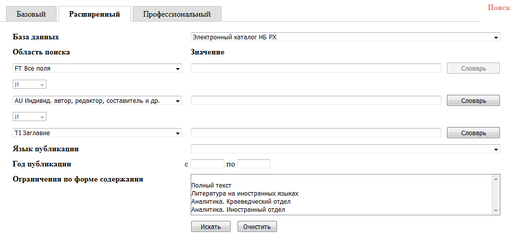 The electronic catalog for the National Library of Khakasiia (elektronnyi katalog) searches all types of library holdings across both state and municipal libraries. There are number of different databases users may choose from to conduct searches. These databases include: