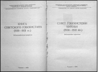 This 203-page item is mentioned in Edward Allworth’s Soviet Asia, bibliographies : a compilation of social science and humanities sources on the Iranian, Mongolian, and Turkic nationalities, with an essay on the Soviet-Asian controversy (U of I Library call number Central Asian Reference 016.301451 AL5S), but was not available for review. At the time of this writing it is unclear whether the bibliography indexes only the publications of the Uzbek state publishing house (Uzgiz) or is of a more general nature, as well as whether any subsequent issues were published.