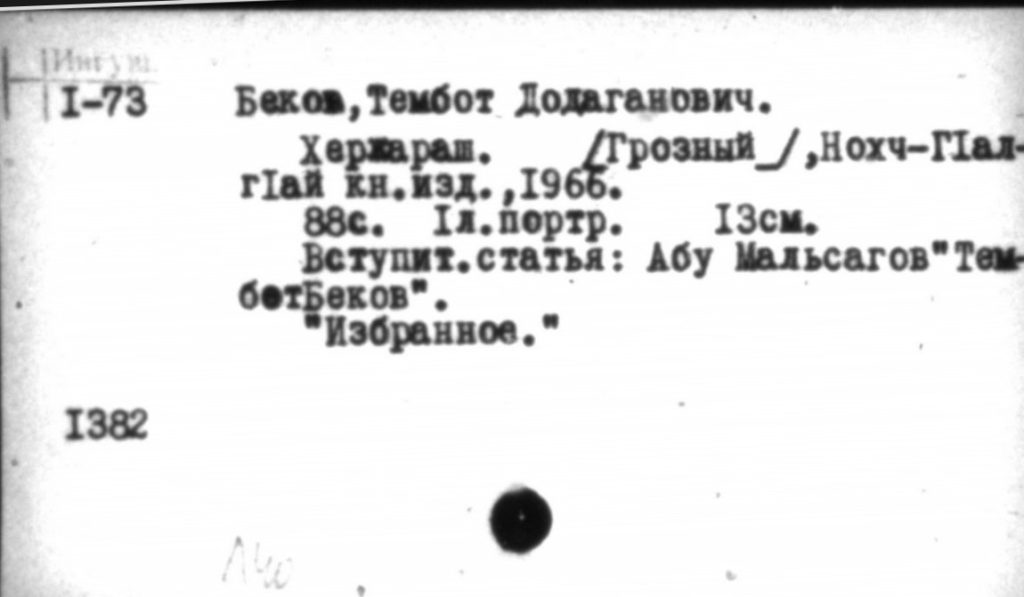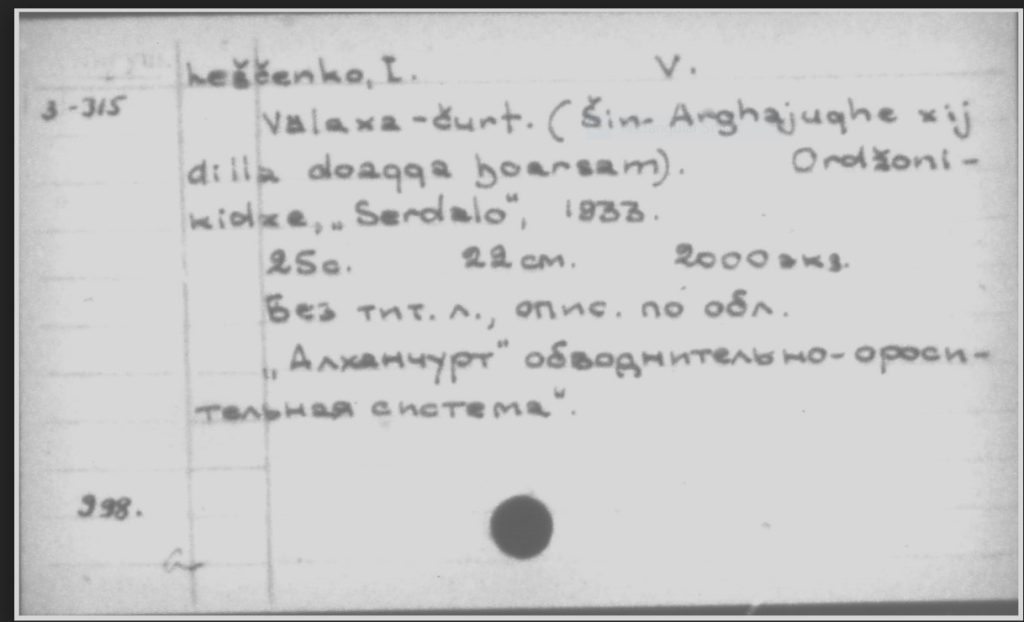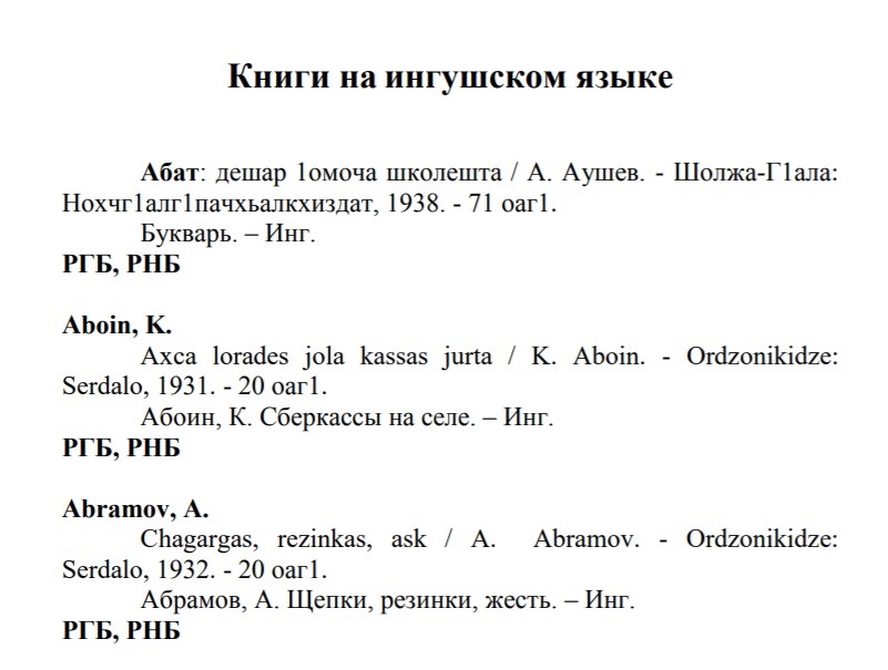 The Russian National Library’s Department of Literature in National Languages (also known as the Department of National Literatures) of the Russian Federation, the Commonwealth of Independent States, and the Baltic countries has reproduced holdings catalogs in microfiche format. The imprints catalogs diffuse most of the difficulties associated with transliteration in the vernacular languages, spelling, forms of entry, and uncertainties with the entirety of the collection. Researchers can access the entire holdings for a specific language at the Russian National Library through the microfiche set; conveniently exporting selected titles via PDF scans. The catalog of literature in Ingush contains holdings of all Ingush imprints located in the National Library of Russia. It is arranged in alphabetical order by author/title. The following scans reflect some of the Ingush-language holdings from the catalog.
