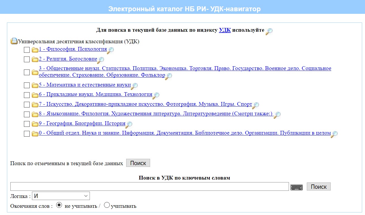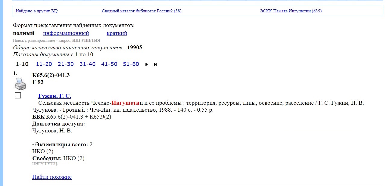 The National Library of Ingushetia has an online catalog (note that it has limited hours; can be accessed only when the library is open: 9am – 6pm Mon-Fri, 10am – 6pm Sat, GMT+3). There are several options for searching the catalog: