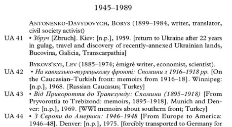 In Ukrainian. Lists publications of all genres that appeared in Ukrainian between September 1939 and December 1941 in the territories controlled by Nazi Germany, including fiction, scholarly publications, proclamations, textbooks, and translations.