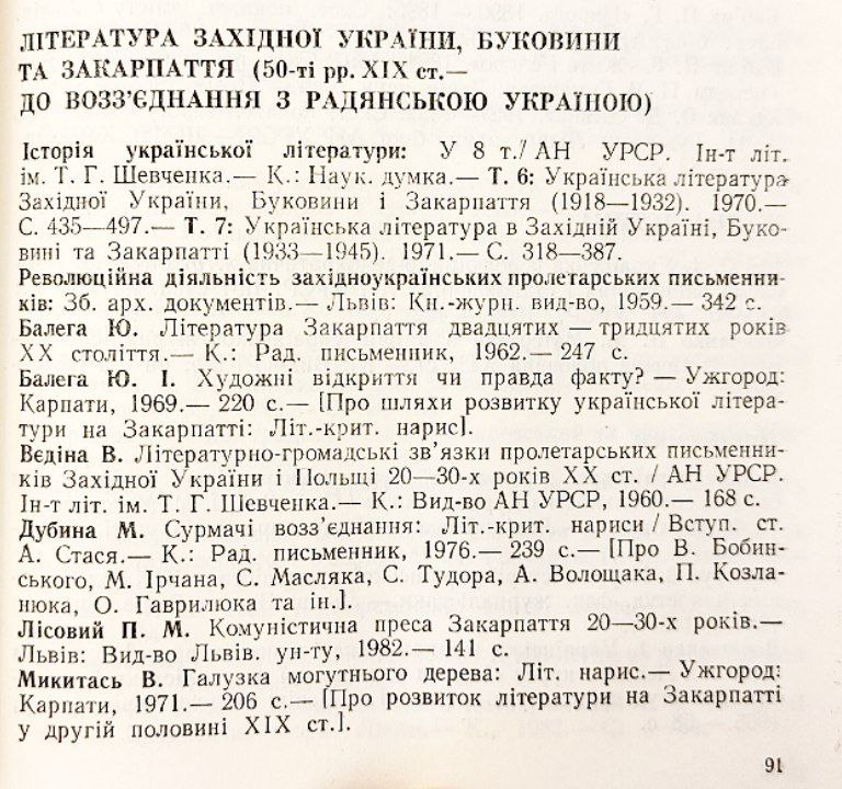 The fall of both Russian and Austro-Hungarian empires in the wake of WW1, the ensuing revolutionary attempts to establish independent states both in Central and Western Ukraine, their failure to repel foreign invasions, and the war between two political entities that claimed ethnic Ukrainian lands — the USSR and Poland — resulted in abrupt changes in the cultural and literary landscape, which many of the listed bibliographies reflect. In Soviet Ukraine, a brief period of Ukrainization in the 1920s (part of wider indigenization policies throughout the Soviet Union) brought about vibrant developments on the literary scene. This literary generation is mostly known now as the Executed Renaissance since so many of them were shot, sent to labor camps, or simply silenced into oblivion during the Stalinist purges of the 1930s. In Western Ukraine ruled by Poland, the climate for Ukrainian cultural production was nowhere nearly as harsh as in the Soviet Union, yet, still, the literature of the period reflects an understanding of a threatened national identity. The inhabitants of Subcarpathia (what is now known as the Transcarpathia region of Ukraine), which has been on the margins of the processes of literary language unification in the nineteenth century and ended up in Czechoslovakia during the interwar period, developed a sense of a separate identity and a unique literary language that is most often referred to as Rusyn or Carpatho-Ruthenian (as to distinguish from the use of the term “Ruthenian” to identify the language of the Orthodox Eastern Slavs in the Polish-Lithuanian Commonwealth and Ukrainian language in the Austria-ruled Eastern Galicia). Bibliographies in this guide reflecting an understanding of the cultural production of this region as a separate one have been published as early as the 1940s, while others reflect literary production from Transcarpathia besides that of our regions of Ukraine.