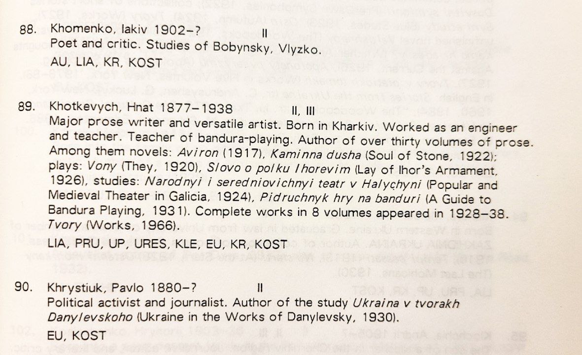 In Ukrainian. A comprehensive 5-volume biobibliographic dictionary covering Ukrainian literature since the times of Kyivan Rus’. The entry dedicated to each author contains some of the following types of information (exact organization varies between the volumes): brief biographical essay; bibliography of first editions of their publications and the most important renewals (e.g. in collected editions and anthologies); bibliography of selected critical publications about the author; bibliographies dedicated to this author. The first volume is dedicated to Old Ukrainian literature, that is, from the times of Kyivan Rus’ up to the 1798 publication of the first literary work in vernacular Ukrainian. The second and third volumes cover publications between 1798 and 1917, and the fourth and fifth volumes overview the authors between 1917 and 1960. A downside of this edition is that it is organized as a dictionary, which is especially obvious in the first volume where entries like “Polemic literature” or “Prose literature” may appear beside entries dedicated to individual authors whose names start with “P.” The coverage of the Soviet period is not comprehensive: while some of the repressed authors have been already posthumously rehabilitated by 1960 and returned to the readership, others, like Khvyliovyi, haven’t been yet. Hence, for the 1920s, the Ten Years… edition listed below is a better source, while the present edition is an absolute go-to for the earlier periods of Ukrainian literature.