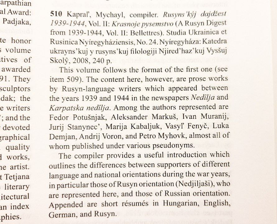 In Rusyn and Hungarian, foreword and afterword in Ukrainian. This is a facsimile reprint of a 1944 General Bibliography of Subcarpathia, which aims to overview all publications ever published (1) in Carpathian Ruthenia (now Transcarpathia) in the Rusyn language, (2) by Rusyn authors in any language, and (3) publications in any language dealing with Rusyns or Subcarpathia. Literature and literary scholarship are covered by the two supplements instead of the main body of the bibliography.