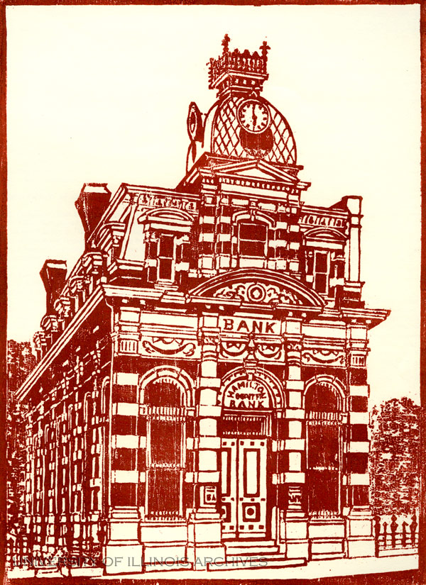 This interest in history led to three decades of artistic projects. Fred and Betty Turner did not send out usual holiday greet cards, but woodblock prints that Fred Turner made of historic sites in Illinois. Fred Turner’s original prints were crude, but over the years his carving and printing skills improved. On the inside of each card, the Turners identified the site, the year it was built, and included historical information on the site.