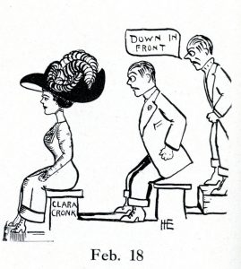 Clara and her beau were a recognizable campus couple. Clara began seeing Arthur Marvin Morris after arriving in Champaign. Arthur was a member of Phi Delta Theta and Phi Delta Phi, president of the Athletic Association, and was a member of the Senior Hat committee. He graduated in 1913 with a degree in law. [7] The pair was mentioned in a poem on popular couples in the 1913 Illio, which read, “Behold, here comes Miss Clara Cronk,/ With Morris, you know Art,/ Why do they look so cheerful now?/ They’re pierced by Cupid’s dart” [8]. She was a frequent fixture at Arthur’s fraternity house; a joke meeting minutes for Phi Delta Theta reads, “President Conrad called the meeting to order but a quorum was lacking. Sergeant-at-Arms…instructed to call up Clara Cronk” [9].
