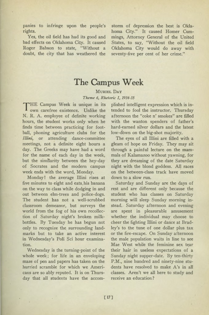 The Green Caldron, produced by the English Department from 1931-1970, captured the “best of” first year rhetoric essays. Two examples that describe student life include “The Campus Week” (January 1935), an outline of a typical week on campus, and “Hogwash for College Students,” an account of and commentary on Vice President Richard Nixon’s visit to UI (April 1955):