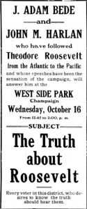 On April 8, 1912, presidential candidate Roosevelt arrived in Champaign on a northbound train from Mattoon. For forty minutes at West Side Park, to a crowd of over 3000 people, Roosevelt advanced his key policy issues. First, that political change must come from the public rather than the government and that ideal public servants were honest, courageous, and had common sense. Second, that in order for the country to be a better place for our grandchildren that all Americans must be given a fair chance. Such a policy would include new laws or regulation of corporations to reduce “swindling” of the people, labor regulation to prevent child labor and women working longer than necessary, and government officials who truly represent the people. After his speech, Mr. Roosevelt was driven along Main Street to Urbana where he thanked the people for his reception before boarding his next train.