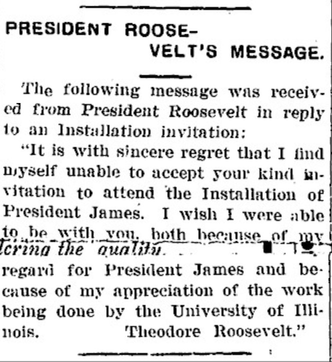 The second invitation came in 1905, when President Roosevelt was invited to attend the inauguration of University president Edmund Janes James. While Mr. Roosevelt could not attend, he did write a letter of appreciation of both University President James and the University too (as seen above). Meanwhile, more oratorical debates would occur. In October of 1905, Adelphic Society members listened to R.R. Helm’s “Roosevelt in 1908” and C.J. Moynhian’s “Roosevelt’s Efforts to Reform Football”. While during the following fall, at least one Daily Illini cartoon compared recent campus reforms with Roosevelt Administration led reforms (as seen below).